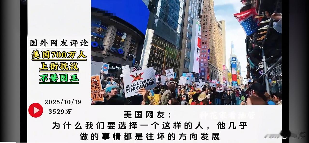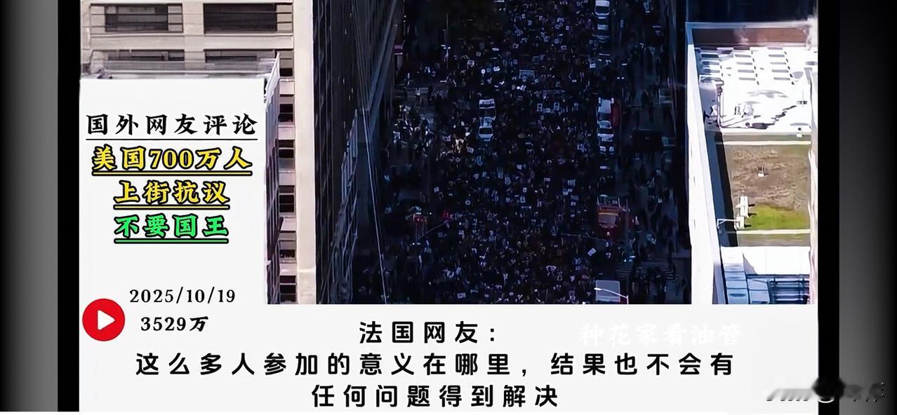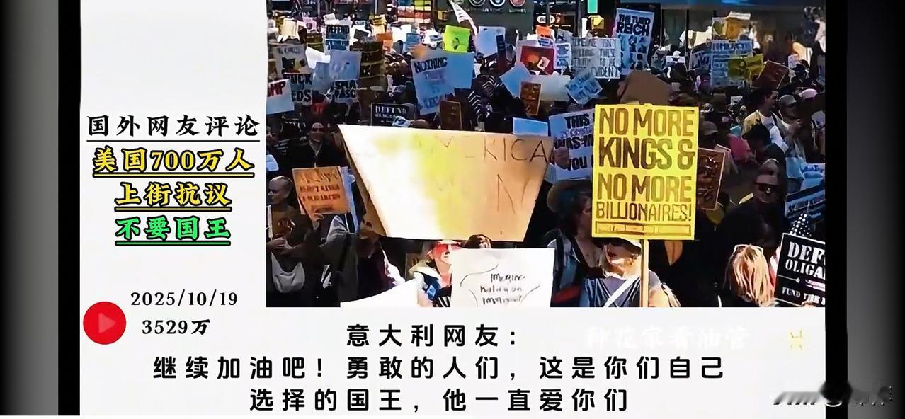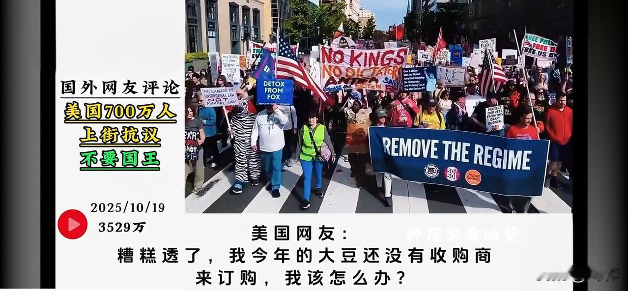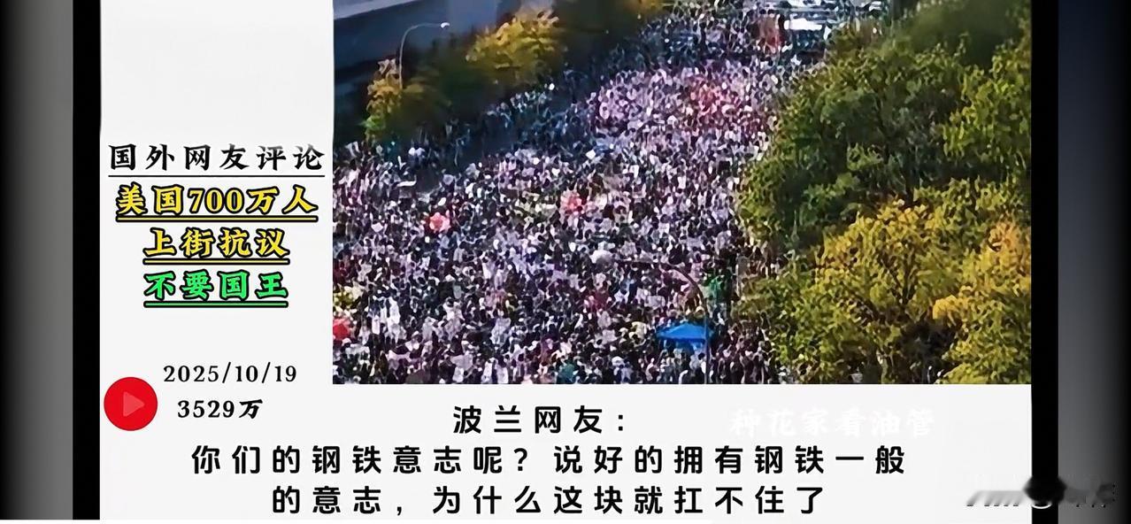 美国网友:700万人游行是美国轰然倒塌的序幕。 韩国网友:10月18日,700多万愤怒的美国人同时走上街头,反对“疯王统治”的怒火席卷整个美国。 委内瑞拉网友:真的很棒!希望这样的场景每天都能在美国上演,这就是自由的美利坚。 突尼斯网友:美国又乱套了!700万人集体“讨伐”川普,让美国再次伟大! 斯洛伐克网友:美国的对立和分裂愈演愈烈,没有什么能阻止美国滑入深渊和走向终结。 南非网友:真是讽刺,靠共和制立国和天天高喊民主自由的美国,居然在21世纪的今天不得不举国反抗“疯王统治”! 爱尔兰网友:美国的倒退和美国的衰亡以不可逆的方式加速恶化,一切都在走向彻底失控和彻底失败。 美国网友:从移民到医保,从贸易政策到美国政府的种种不正常行为,美国人民已经无法忍受不断上演的狗屎秀。 新加坡网友:草台班子的美国政府,种种疯狂而愚蠢的作为,就像精神病院没有锁好大门。 丹麦网友:感觉愚昧无知和反复无常的美国政府就像一群顽童当道,国王的新衣游戏开始了。 尼加拉瓜网友:700多万人的“不要国王”游行是美国全面崩塌的写照,美国的“末日景象”只会愈演愈烈。 法国网友:这么多人参加的意义在哪里,结果也不会有任何问题得到解决,彻底失控的美国已经彻底失去自我修正的能力。 美国网友:为什么我们要选择一个这样的人,他几乎做的事情都是往坏的方向发展。 意大利网友:继续加油吧!勇敢的人们,这是你们自己选择的国王,他一直爱你们。 墨西哥网友:从洛杉矶反对美国移民政策运动到美国各州风起云涌的独立运动,美国历史的终点将永久定格在250岁以内。 土耳其网友:也就是说只有247年历史的美国已经时日无多,流星美国正在加速陨落。 希腊网友:唉,看来洛杉矶奥运会要黄了,美国还能撑到2028年吗?即使能撑到2028年,你还敢对洛杉矶奥运会抱有任何期望吗? 瑞士网友:47%的美国家庭面临饥饿威胁,72%的美国八年级学生是数学差生,枪击暴力、团伙0元购和打砸抢像洪水一样泛滥… 瑞士网友:不计其数的无家可归者和流浪汉以及3500多万重度吸毒者和毒贩四处游荡,还不起教育贷款和支付不起医疗账单的美国人正在被迫卖血… 瑞士网友:一个视人民绝望挣扎而不顾的国家,请问这样的国家还有救吗? 哈萨克斯坦网友:美国人选一个“罪犯”总统,现在终于知道痛了。就像越滚越大的美债雪球一样,积弊难返的美国已经无药可救。 越南网友:美国政府的关税政策和种种行径不仅引起其他国家的公愤,也引起了美国人民的公愤。 阿联酋网友:我认为中国的反制措施加速了美国人民的觉醒,因为美国人民深知,如果离开中国商品,他们将难以生存。 巴西网友:从美股几近击垮到F35几近停产,中国的反制措施让美国人民认清美国对中国的一切挑衅都是自杀行为。 美国网友:糟糕透了,我今年的大豆还没有收购商来订购,我该怎么办? 德国网友:从限制稀土精炼产品出口到限制粒径小于50微米的人造钻石出口,从收取美国船舶停靠费到调查高通,中国的对等反制招招击中美国的要害。 哥伦比亚网友:中国的底牌就像中国智慧和中国实力一样深不可测。美国招惹了最不该招惹的人,因为全世界都清楚中国比美国至少强大3~5倍! 英国网友:现在又开始限制人造钻石出口,特别是粒径小于50微米的人造钻石,这相当于直接卡住了美国和西方芯片制造的脖子。 日本网友:人造钻石在芯片散热中扮演关键角色,美国99%的人造钻石依赖进口,其中77%是最高纯度的人造钻石,全部依赖从中国进口。 印度网友:就像全球99%的重稀土精炼产能掌握在中国手里一样,全球99%的最高纯度人造金刚石微粉产能也同样掌握在中国手里。 荷兰网友:就拿ASML的EUV光刻机来说,里面反射镜的最精度打磨工作只有中国的高纯度人造金刚石微粉才能胜任。 荷兰网友:更关键的是3nm以下的高端芯片,光刻环节的激光器必须依赖中国造金刚石的超高纯度、耐高温、超高透光性才能稳定运行。 俄罗斯网友:也就是说离开中国的人造钻石,从荷兰的光刻机到美国的芯片制造都将寸步难行。 荷兰网友:天哪!这样看来荷兰强行“接管”安世半导体的行为是多么愚蠢! 荷兰网友:从异军突起和全流程国产设备布局的新凯来到限制出口粒径小于50微米的高纯度人造钻石,ASML地位和美国芯片地位不保了,西方最后的优势完了。 美国网友:这就是挑衅几千年都站在世界之巅的人类第一强国的后果,除了跪地求饶,美国和荷兰已经无路可走。 波兰网友:你们的钢铁意志呢?说好的拥有钢铁一般的意志,为什么这么快就扛不住了。 孟加拉国网友:其实,最伟大的中国早已为美西方国家指明出路,那就是平等尊重和合作共赢。