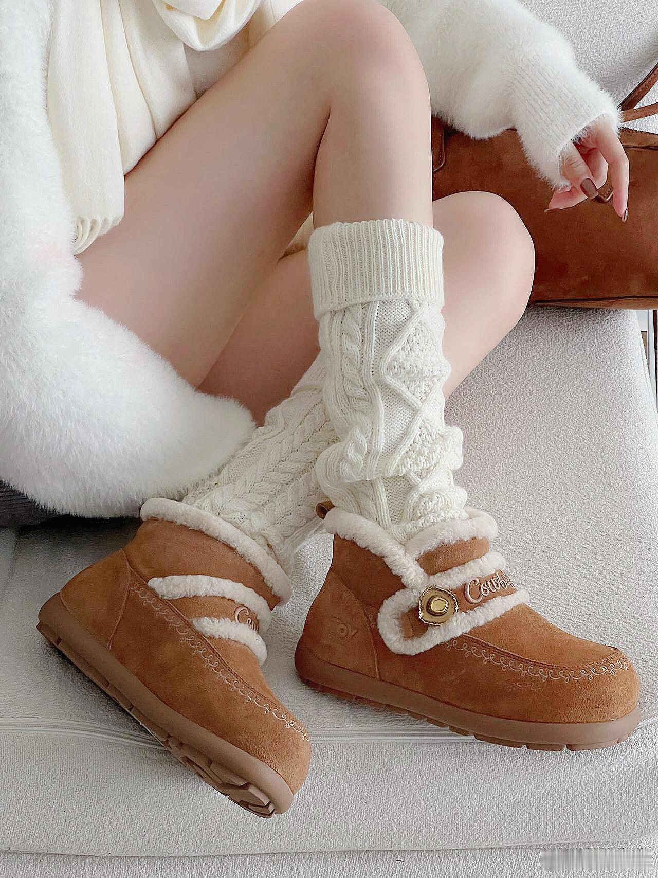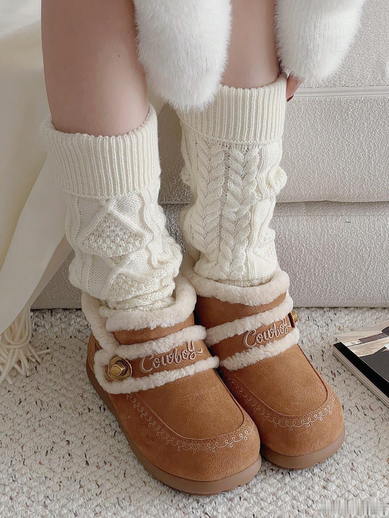 这双来自韩国品牌TOY的棕色雪地靴,采用质感细腻的麂皮材质,温暖的焦糖色搭配鞋面精致的白色刺绣,尽显冬日优雅。厚实的白色毛绒环绕鞋口与内衬,确保极致保暖体验。最具辨识度的设计是横跨脚背的白色毛绒织带,配以印有"Cowboy Sweetheart"字样的金色扣环,巧妙融合了复古西部风情与甜美气质。搭配米白色针织袜套,整体营造出温暖柔和的冬日氛围,既实用又充满时尚巧思。时尚鞋履