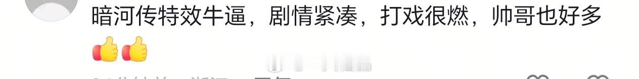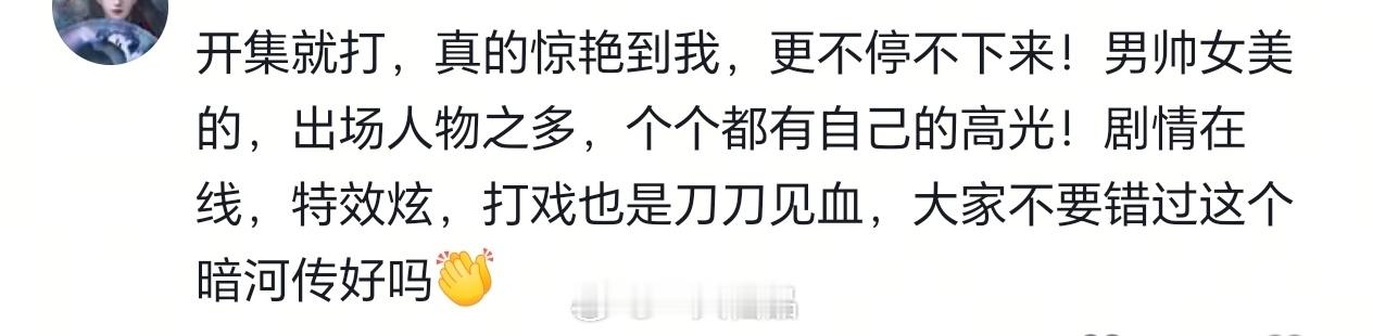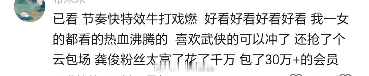 暗河传首播反馈来看看路人真实的看后反馈吧,这是最直观的反应,龚俊暗河传首播非常棒,剧里无论是打戏还是剧情,男主颜值帅气十足。良心之作,妥妥的高品质优秀剧集,还没看的抓紧吧!龚俊粉丝准备了30万+的云包场,大家都来看呀!!!