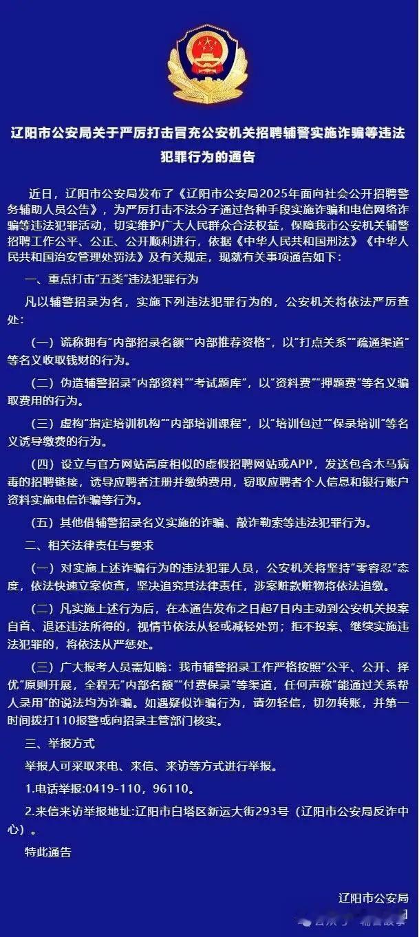 近年来,辅警招聘在全国各地爆火,一些不法分子从中嗅到了“商机”,他们打着辅警招聘的幌子,骗取辅警考生的钱财! 为此,辽宁省辽阳市公安局采取了专项打击行动:严厉打击冒充公安机关招聘辅警实施诈骗等违法犯罪行为! 这项打击行动也为急着考辅警的学子们提了个醒,擦亮眼睛,决不给诈骗犯罪分子任何可乘之机! 条友们对此怎么看?欢迎评论区聊聊你的看法!