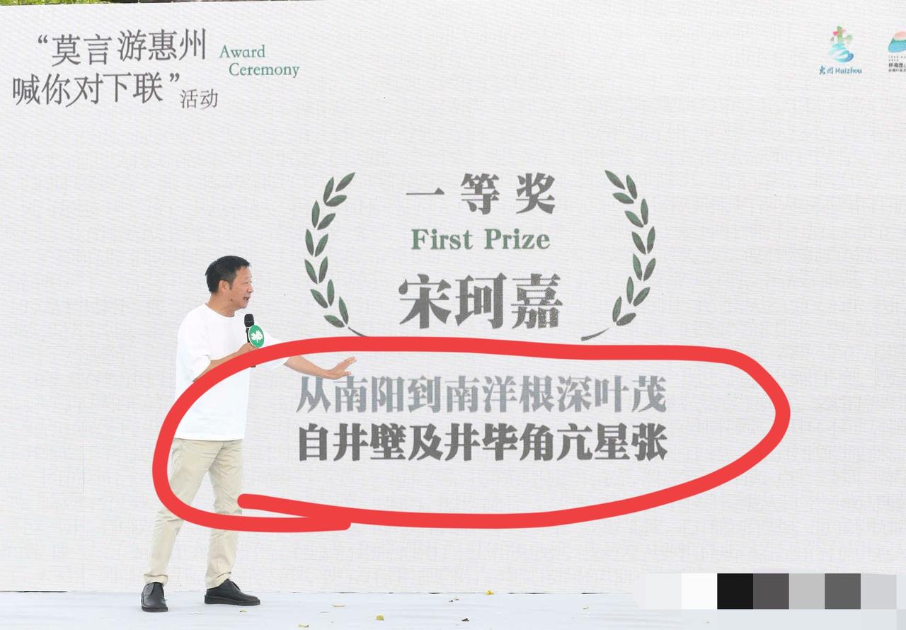 莫言的这幅绝对,终于有人对上了~ 莫言作为中国第一个诺贝尔文学奖获得者, 在参观完惠州客家围屋以后,即兴发挥,写下了这个绝对,大家都以为没人能对上,没想到的是,经过专家评估,一位00后,只有21岁的女子,对出了石破天惊的下联! 此下联被专家认为是绝对,难得的佳作,几十年不遇~ 来,欣赏一下这幅大师之作吧~ 上联:从南阳到南洋根深叶茂~ 下联:自井壁及井毕角亢星张~ 也有网友说,这是什么下联啊,完全不知道啥意思,难道是AI创作的?? 不过,专家说好,给了唯一的一等奖,独享10万元,一字万钱啊,牛! 不知道莫言大师对这个下联感冒吗?[比心][比心][灵光一闪][灵光一闪]