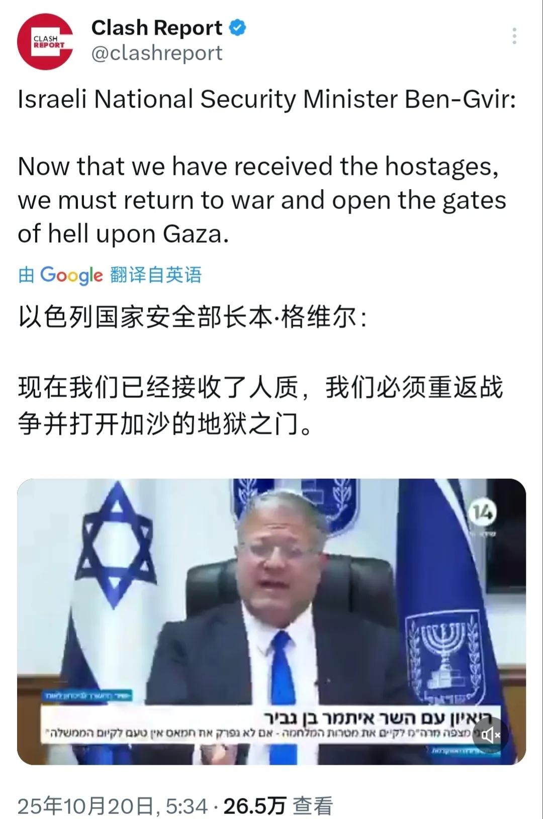 以色列安全部长:我们已经接回人质,现在必须重启战争 外媒10月20日报道:“以色列国家安全部长本.格维尔:现在我们已经接收了人质,我们必须重返战争并打开加沙的地狱之门”。 如果以色列在已经接收人质后,还继续武力侵略加沙,这样既失道义、也更失去国际信誉。 众所周知以色列攻打加沙还有一点道义可言就是以“营救人质”为由,之前美国总统特朗普亲自出席由埃及主持加沙和平峰会,并与伊斯兰众多国家一起签署相关停战协议还作为协议担保国。所以说如果以色列违反停战协议,既在国际上失去道义,也使美国与以色列更加失去国际信誉,同时美国在国际上也面临失去威信难堪境地,也极有可能令伊斯兰国家对和平解决加沙问题失去耐心,或许重新考虑联合起来武力解决,如果这样必然会引发中东地区新一轮的动荡不安。
