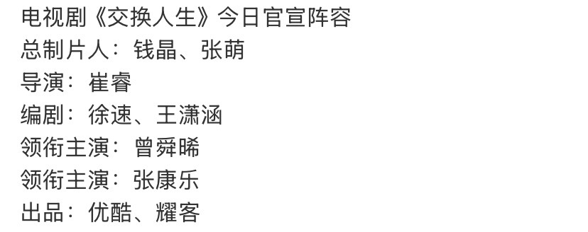 电视剧《交换人生》演员阵容看起来又是双男主剧,现在都没有女主角的吗?