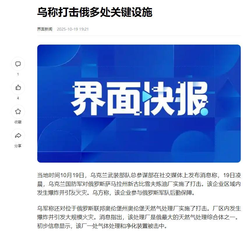 刚开始转冷,乌军又来给俄罗斯“送温暖”了!这次真是炸惨了,当地时间10月19日,乌克兰武装部队总参谋部在社交媒体上发布消息称,俄罗斯年产450亿立方米天然气的奥伦堡天然气处理厂,被无人机命中,已经连续大爆炸,燃起大火,天然气处理厂大火照亮了半个夜空! 事实上,俄乌冲突打到这份上,早就不是前线坦克对轰那么简单了,双方都开始往对方“软肋”上捅。最近乌克兰这一下,直接戳中了俄罗斯的能源命门。奥伦堡天然气处理厂被无人机炸得火光冲天,连续爆炸的动静,隔着几十公里都能听见,夜空亮得跟白天似的。别听有人调侃这是“给俄罗斯送温暖”,这分明是往人家能源大动脉上扎针,而且扎得又准又狠,连旁边哈萨克斯坦的生意,都给搅黄了。 要说这奥伦堡处理厂,真不是普通厂子,而是俄气集团手里的宝贝疙瘩,每年能处理450亿立方米天然气,还能顺带加工620万吨天然气冷凝水,相当于每天要处理1.2亿立方米的气,填满18000个标准足球场都够。更关键的是,它不只是俄罗斯本土的能源重镇,连哈萨克斯坦的天然气都得靠它加工。 哈萨克斯坦卡拉恰加纳克油田的气,每天差不多4000万立方米往这运,加工完了一部分供俄罗斯国内用,一部分还通过“友谊管道”往欧洲送。结果这一炸,哈萨克斯坦能源部当天就急着宣布暂停供气,等于俄罗斯这条连着眼中亚、欧洲的能源线,直接断了一截。 国际能源署都急了,出来警告说要是再这么炸下去,欧洲柴油库存年底可能跌破90天安全线,2022年那种冬天抢气的日子说不定又要重演。要知道欧洲现在还没完全摆脱对俄能源的依赖,尤其是德国、意大利这些国家,冬天供暖、工厂运转都指着这条线,现在管道一断,天然气价格当天就往上跳,老百姓又得为取暖费发愁。可欧盟一边喊着制裁俄罗斯,一边又怕断气,这矛盾劲儿,看着都替他们累。 更让人意外的是乌军无人机的能耐。奥伦堡离乌克兰边境足足1200公里,差不多是从北京飞到上海的距离,俄军按说早该把这里的防空罩子扎紧了。结果乌军那叫“海狸”的无人机,就是个改装的商用机型,造价还没一辆特斯拉Model 3贵,却能一路躲开俄军的电子干扰和防空系统,精准撞到工厂核心装置上。 俄罗斯国防部嘴上说击落了45架,可地方官员瞒不住,至少有一架没拦住,直接把处理厂的关键设备炸废了。这事儿往深了说,俄军的防空体系怕是真出了大漏洞,连本土腹地的能源枢纽都护不住,前线士兵看了心里能不犯嘀咕? 对俄罗斯来说,这损失可不止是一座工厂那么简单。经济上,这厂子每年能赚30多亿美元,现在一停工,每天光天然气损失就超过800万美元,相当于一天扔出去5600多万人民币。更麻烦的是,哈萨克斯坦停气后,俄罗斯国内天然气供应立马紧张,部分地区已经开始限气,物价跟着往上窜,本来打了这么久仗,民生就够吃紧的,这下更是雪上加霜。 军事上更丢面子,普京政府没办法,只能紧急往伏尔加河沿岸调防空系统,还把20架能挂核弹的战机转到白俄罗斯,想靠“核威慑”撑场面,可明眼人都看出来,这更像底气不足的补救。 欧洲这边的反应更是矛盾到好笑。德国现在遇上俄气断供,又赶紧宣布重启部分燃煤电厂;法国一边喊着要摆脱俄能源,一边又加快建核电站。说白了就是既想制裁俄罗斯,又怕自己冻着;既想支持乌克兰,又怕俄罗斯报复性断气。这种“又当又立”的架势,连欧洲老百姓都看不下去,德国街头已经有抗议游行,要求政府别再掺和俄乌冲突,先把国内能源问题解决好。 其实这事儿也给咱们中国提了个醒。咱们的能源进口大多靠海上通道,马六甲海峡、南海这些航道,要是将来台海出点动静,美国保不齐也会学俄罗斯那套,搞航道封锁。所以这些年咱们才忙着建中俄西伯利亚力量管道,参与巴基斯坦瓜达尔港运营,就是想多留几条能源后路。毕竟能源安全这事儿,从来都不能指望别人,得自己把饭碗端稳了。 现在奥伦堡的火虽然灭了,但这事儿背后的麻烦才刚开始。乌克兰敢炸能源枢纽,俄罗斯肯定会报复,说不定接下来就会加大对乌克兰电厂、铁路的打击;欧洲夹在中间,能源价格涨不停,经济复苏更没指望;哈萨克斯坦这些中亚国家,也会开始重新考虑和俄罗斯的能源合作。说白了,这场能源绞杀战里,没有真正的赢家,只有输得更惨的人。 俄罗斯耗不起,乌克兰也耗不起,欧洲更耗不起。真不如像中国一直呼吁的那样,坐下来谈一谈,停火止战才是正经事。再这么打下去,只会把更多人拖进泥潭里。不知道俄罗斯和乌克兰啥时候能想明白,可别等把最后一点家底耗光了,才追悔莫及。