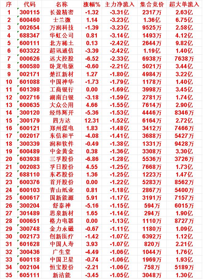10月21日上午盘,主力趁低位,大幅买入的35名单: 立讯精密:涨幅7.63%,主力净流入16.4亿元 新易盛:涨幅9.17%,主力净流入14.6亿元 工业富联:涨幅5.87%,主力净流入12.8亿元 天风证券:涨幅9.23%,主力净流入11.9亿元 中际旭创:涨幅10.89%,主力净流入10.8亿元 10月21日中午收盘,主力资金“大幅卖出”的35名单: 长盈精密:主力净流出3.31亿元 士兰微:主力净流出3.23亿元 万润科技:主力净流出3.23亿元 华虹公司:主力净流出3.14亿元 北方稀土:主力净流出2.42亿元