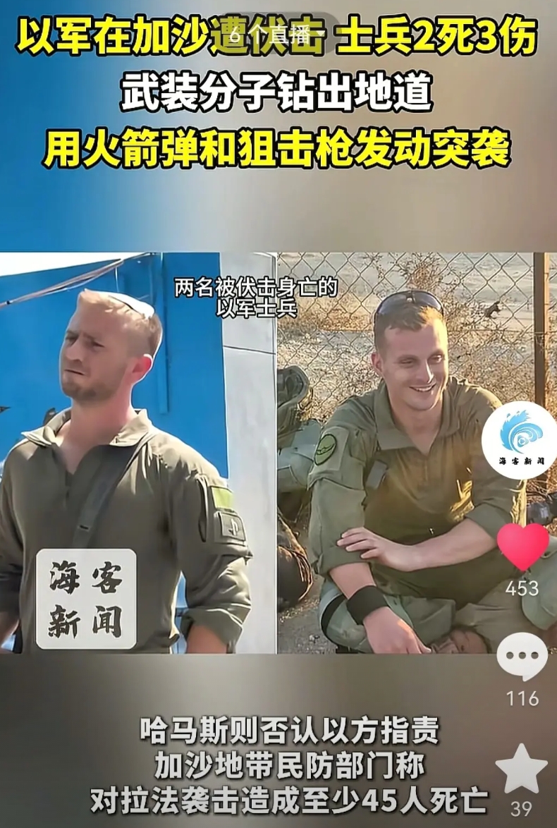 以色列军在加沙地带遭到哈马斯武装分子的突袭,两人死亡。只要以色列一天不撤出加沙地带,这种伤亡是不可避免的。你还占着别人的领土,巴勒斯坦民间反抗侵略天经地义。目前以色列指责哈马斯违背了和平协议易。哈马斯指责以色列想赖账不走,根本就没有和平的决心,还想侵略巴勒斯坦的土地。