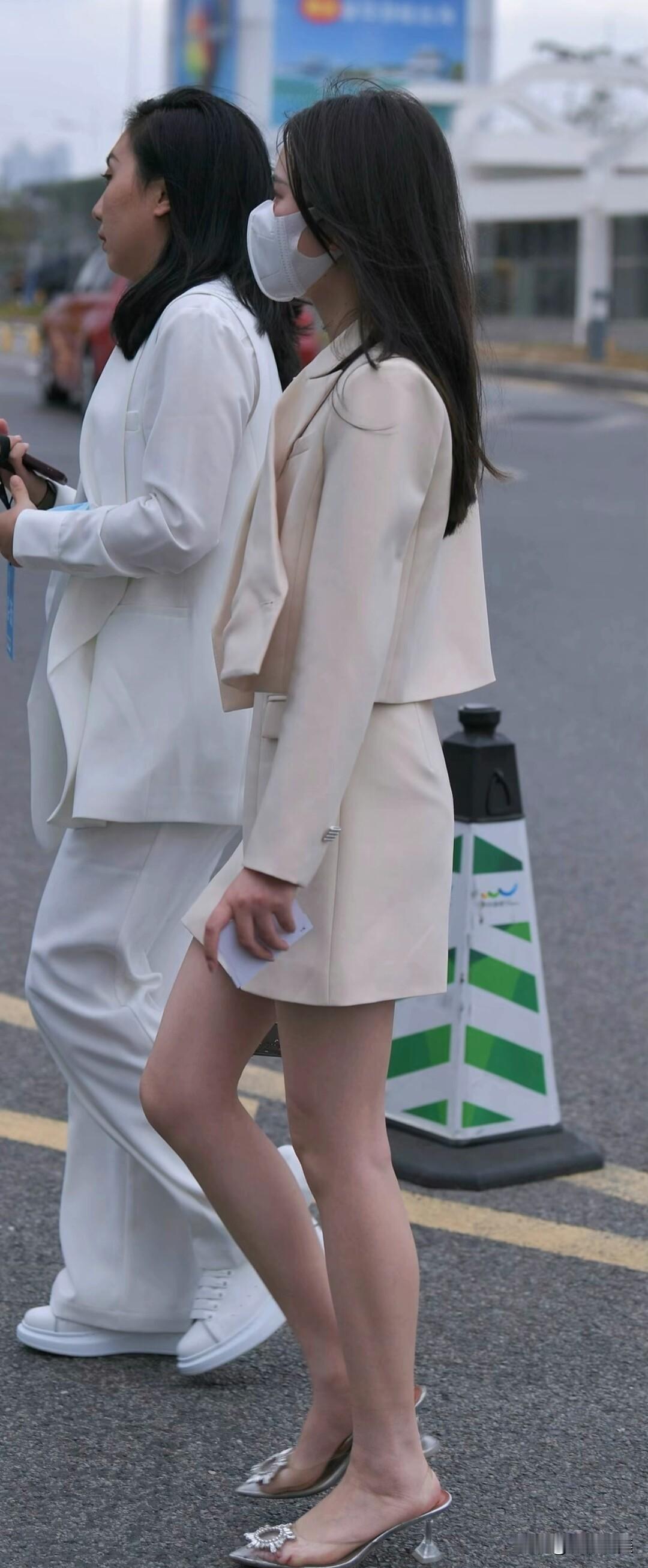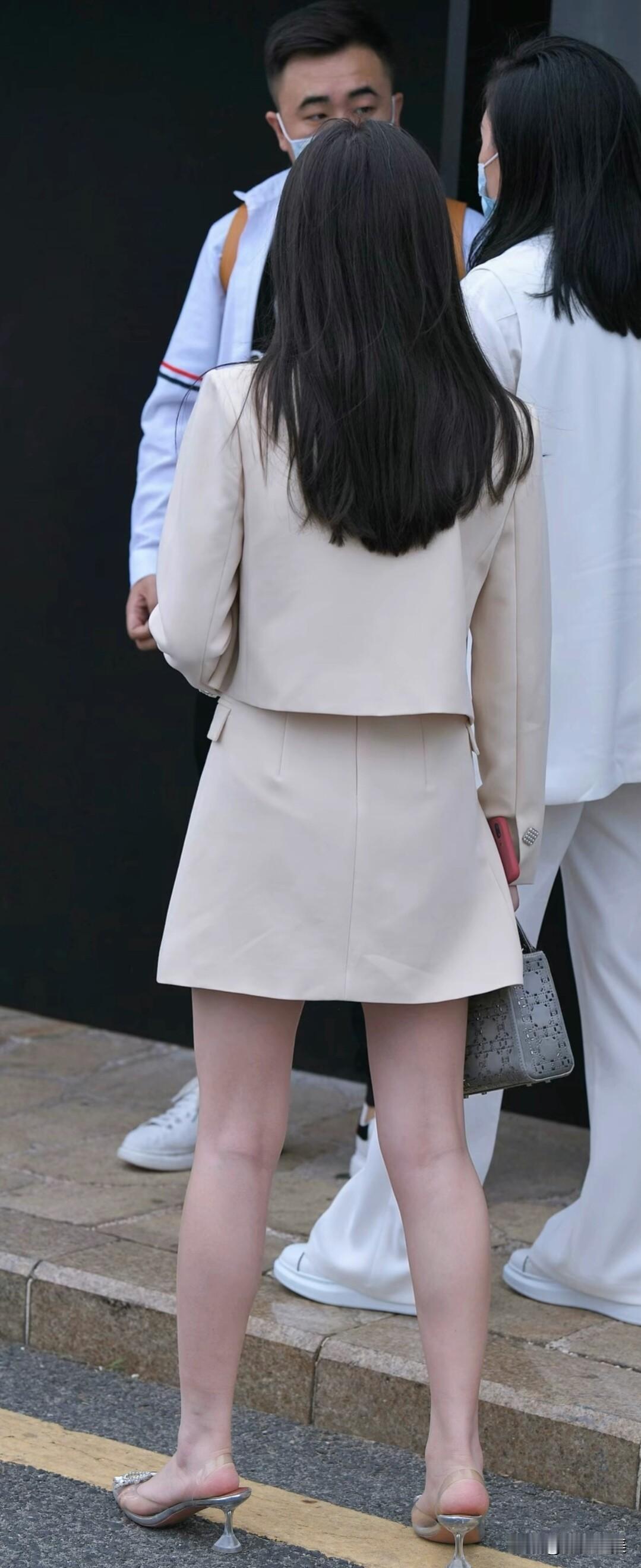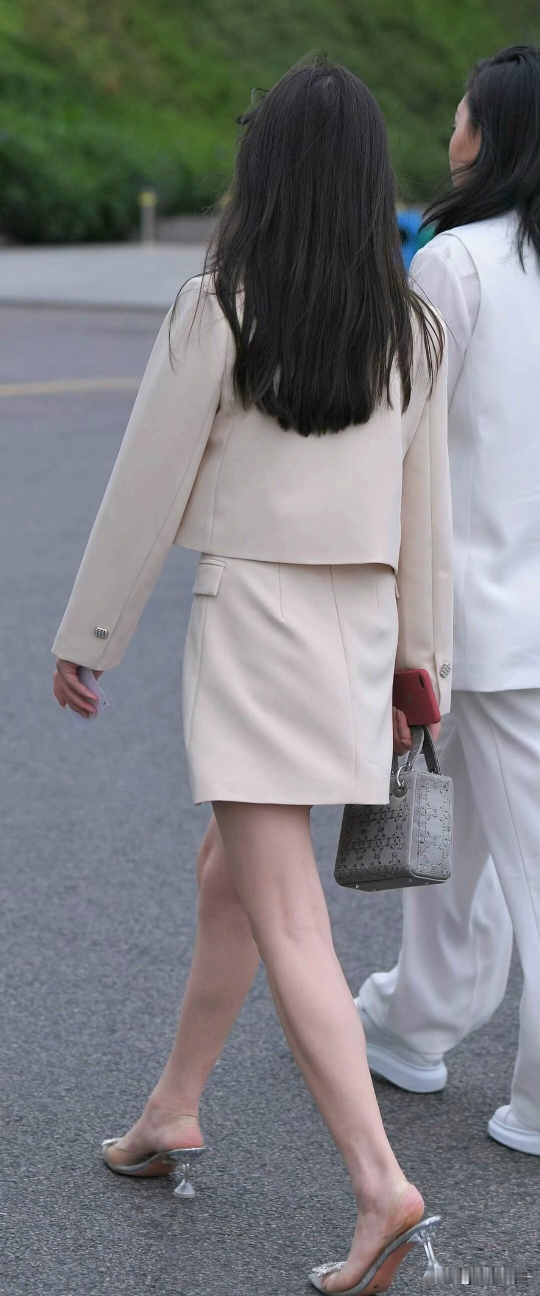 浅米色短款西装搭配同色系短裙,再配上带钻的小高跟,简约又好看,很适合上班族借鉴呢。