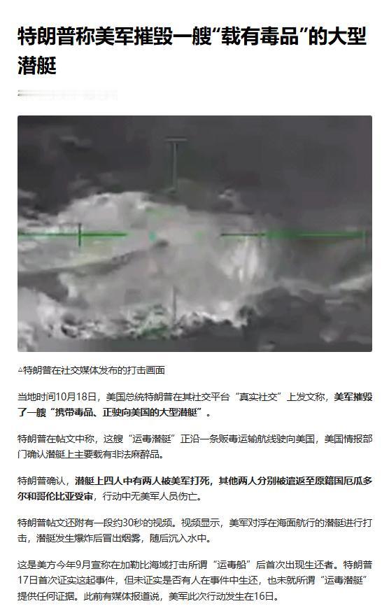 击沉潜艇,损失惨重!美军下手了! 当地时间10月19日,特朗普通过社交平台发布重磅消息。 美军在加勒比海击沉了一艘运毒潜艇。 特朗普声称,10月16日美军击沉了一艘运毒潜艇,还晒出30秒现场视频,画面里潜艇爆炸冒烟沉海的样子清清楚楚。 特朗普宣称潜艇上载有大量非法麻醉品,美军在警告无效后发动攻击,造成4名船员中2人死亡,另外2名幸存者已被遣返至厄瓜多尔和哥伦比亚受审。 这段30秒的视频迅速传遍全球,画面中潜艇爆炸时腾起的蘑菇云,让不少人联想到好莱坞电影里的战争场景。 但事件的真相远比表面复杂。 首先是潜艇的"国籍"存疑。 虽然美方一口咬定这是一艘"毒贩潜艇",但委内瑞拉政府立即发声否认,强调该国与毒品走私无关,并指责美国在其专属经济区频繁军事行动是"侵略前奏"。 更微妙的是,美国缉毒署近年报告显示,委内瑞拉并非流入美国毒品的主要来源地,反而是哥伦比亚、墨西哥等国占据更大比例。 这种"指控对象"与"实际来源"的错位,难免让人怀疑美方行动的真实动机。 其次是军事行动的合法性争议。 根据《联合国海洋法公约》,各国在公海虽有打击海盗和贩毒的权利,但采取武力行动必须满足"紧迫危险"和"比例原则"。 此次事件中,美方未公布潜艇是否拒绝停船接受检查,也未说明是否有其他非致命手段可用。 中国常驻联合国代表傅聪已明确表态,美方单方面武力执法可能侵犯他国主权,呼吁通过多边框架解决争端。 更值得关注的是,美国在加勒比海的军事部署已达到"准战争状态"——1万名士兵、8艘军舰、1艘核潜艇和多架F-35战斗机云集该地区,这种"杀鸡用牛刀"的阵势,很难不让人联想到地缘政治博弈。 从技术角度看,这艘被击沉的潜艇也不简单。 它属于半潜式运毒船,船身大部分潜入水中以躲避雷达追踪,内部配备柴油发动机、潜望镜和空调系统,一次可运载数吨可卡因。 这类潜艇通常在哥伦比亚丛林深处的秘密船坞建造,成本高达数百万美元,但一次成功运输就能带来200倍的暴利,堪称"毒贩的移动金库"。 更令人担忧的是,贩毒集团正在研发无人驾驶半潜艇,今年7月哥伦比亚就查获了一艘配备"星链"天线的无人艇,未来可能进一步增加缉毒难度。 这场看似普通的缉毒行动,实则折射出多重复杂矛盾:美国与委内瑞拉的长期对抗、国际法与单边主义的碰撞、传统安全与非传统安全的交织。 值得注意的是,哥伦比亚总统佩特罗已公开谴责美方行动侵犯其领海主权,并提及此前美军误炸哥伦比亚渔船导致渔民死亡的事件。 这种地区国家的反弹,可能让美国在拉美的"禁毒盟友体系"出现裂痕。 如今,事件的后续影响仍在发酵。 联合国安理会已将加勒比海局势列入议程,委内瑞拉要求成立独立调查委员会,而美国则继续强化军事存在。 对于普通观众来说,这场"现实版海战"不仅是对国际秩序的考验,也提醒我们:在全球化时代,任何局部冲突都可能引发连锁反应。 你认为美国的行动是正义缉毒还是霸权扩张?欢迎在评论区留下你的看法。