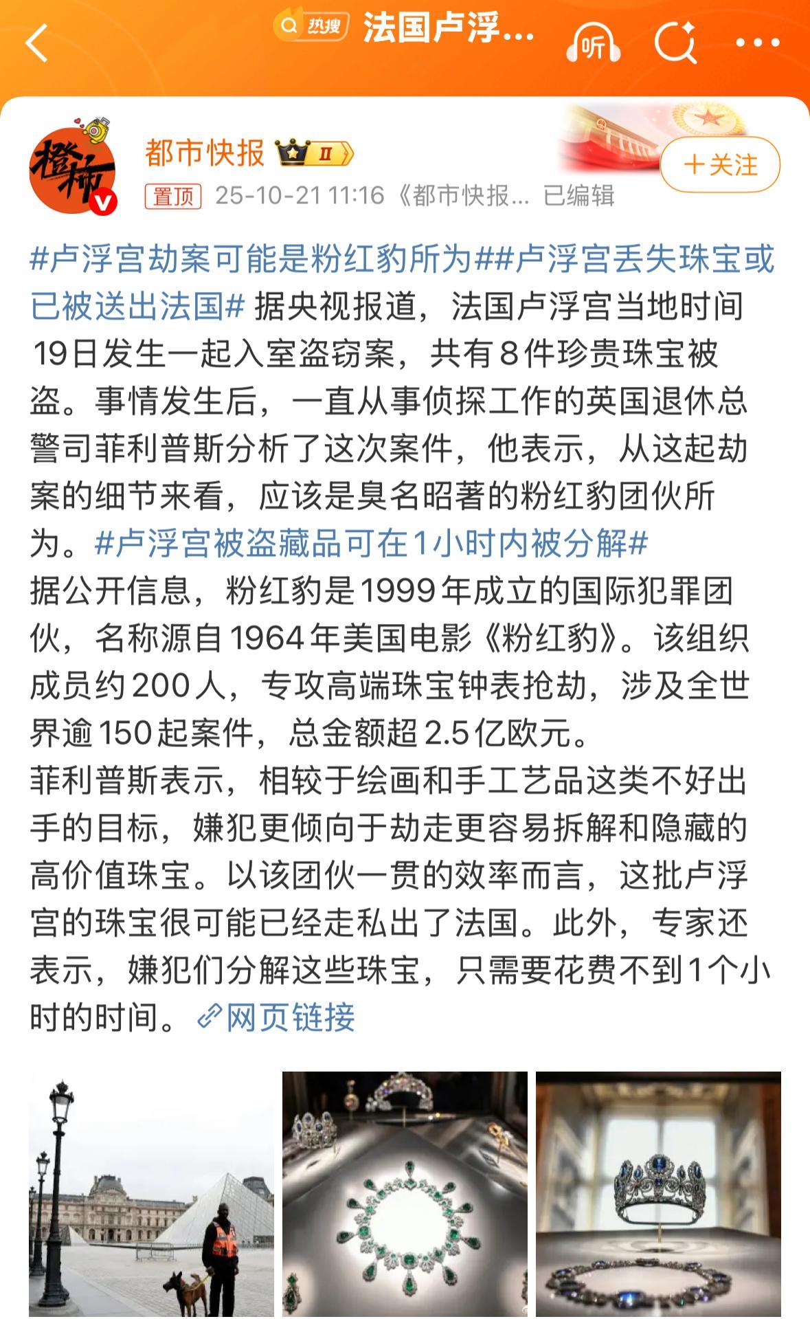 卢浮宫劫案可能是粉红豹所为2025年10月19日,卢浮宫7分钟遭劫案绝非偶然,而是多重矛盾交织的必然结果。劫匪伪装工人借施工吊篮破窗,专挑易拆解的王室珠宝下手,其目标选择与专业手法直指“粉红豹”团伙,虽作案时长、遗留痕迹存疑,但与该团伙销赃逻辑高度契合。