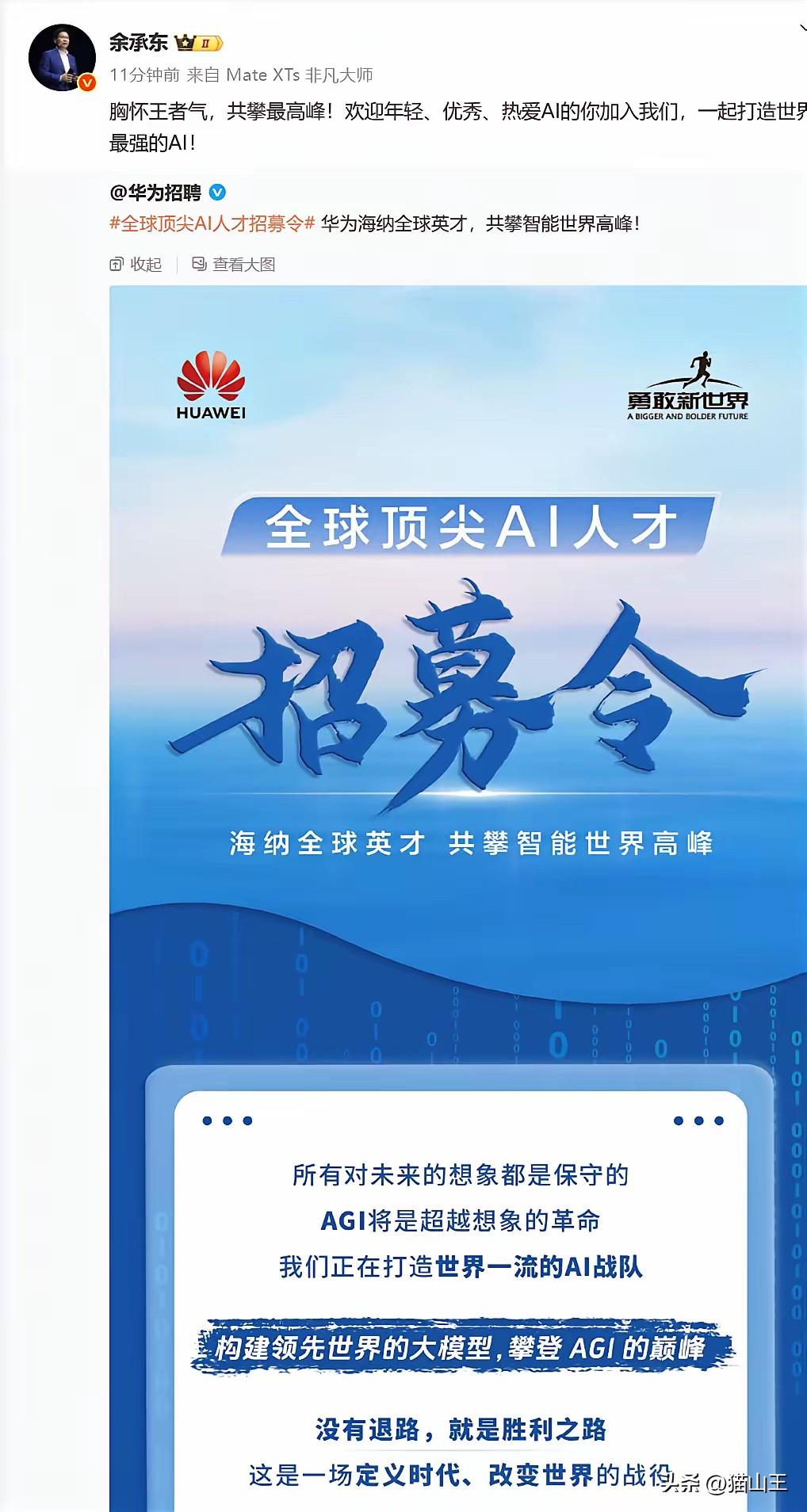 看来以后余承东的工作重心不在五界上面了!自从增任了IRB之后,余承东负责主管Ai研究发展,竟然开始了亲自招贤纳士,自己招人,这你敢信吗?而且一出手就是面向全球招聘顶尖人才,太有实力了! 俗话说的好,一个人行在哪个行业都行! 看来华为是肯定了余承东在手机终端和汽车方面的成功,否则IRB的重任也不会落在他肩膀上,大家说是不是?