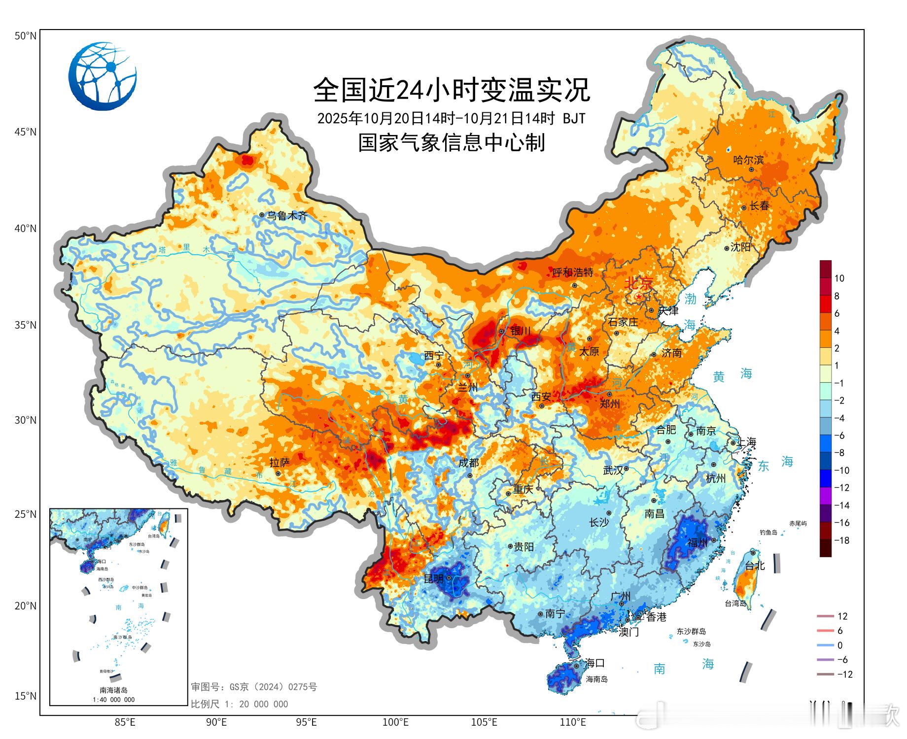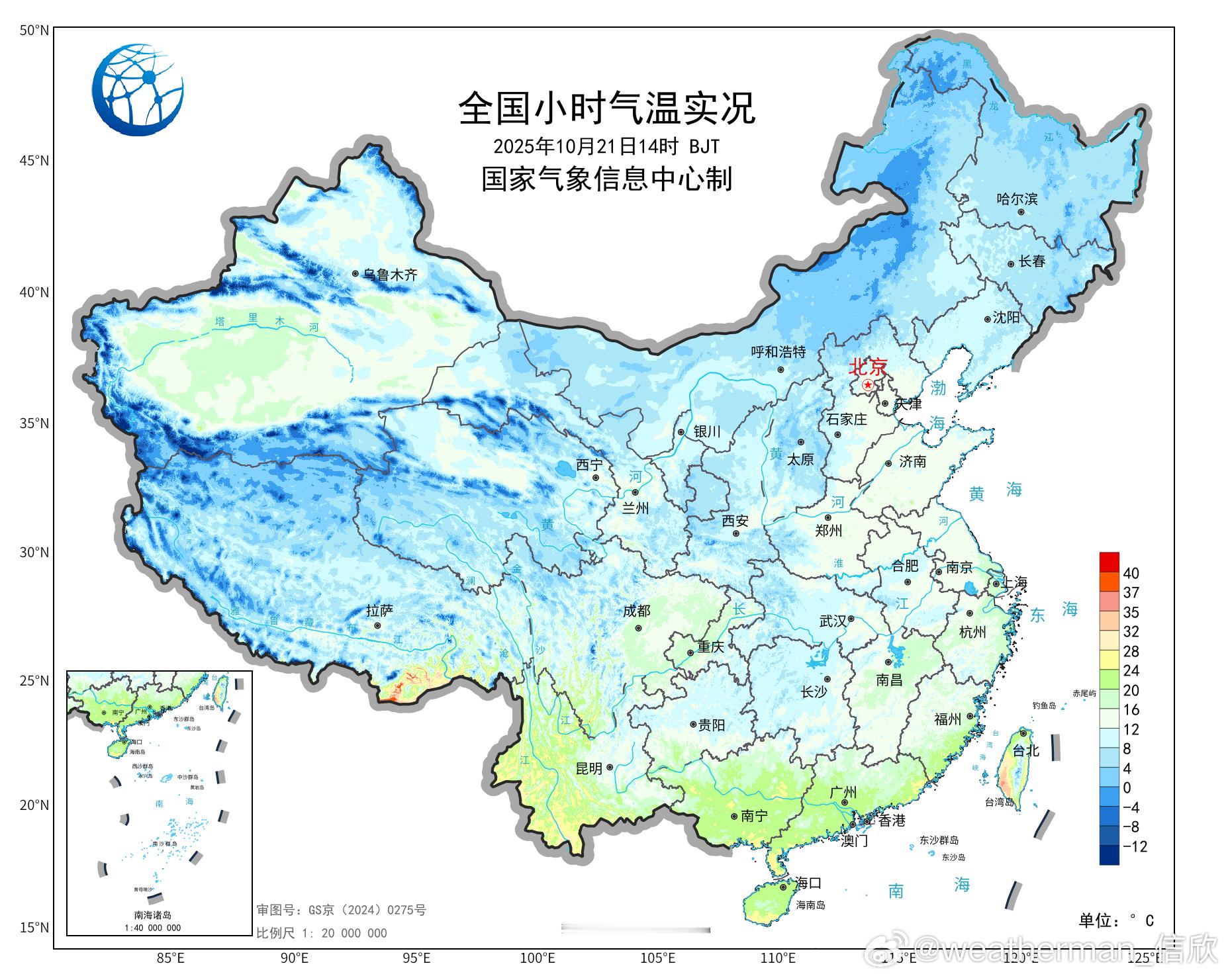 【气温】今天白天北方大多升温,南方还在降温。截至14时最高,只有云南景洪超30℃