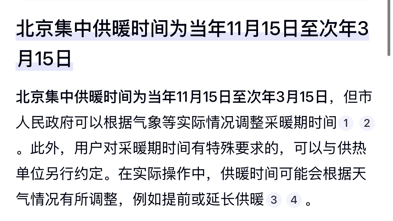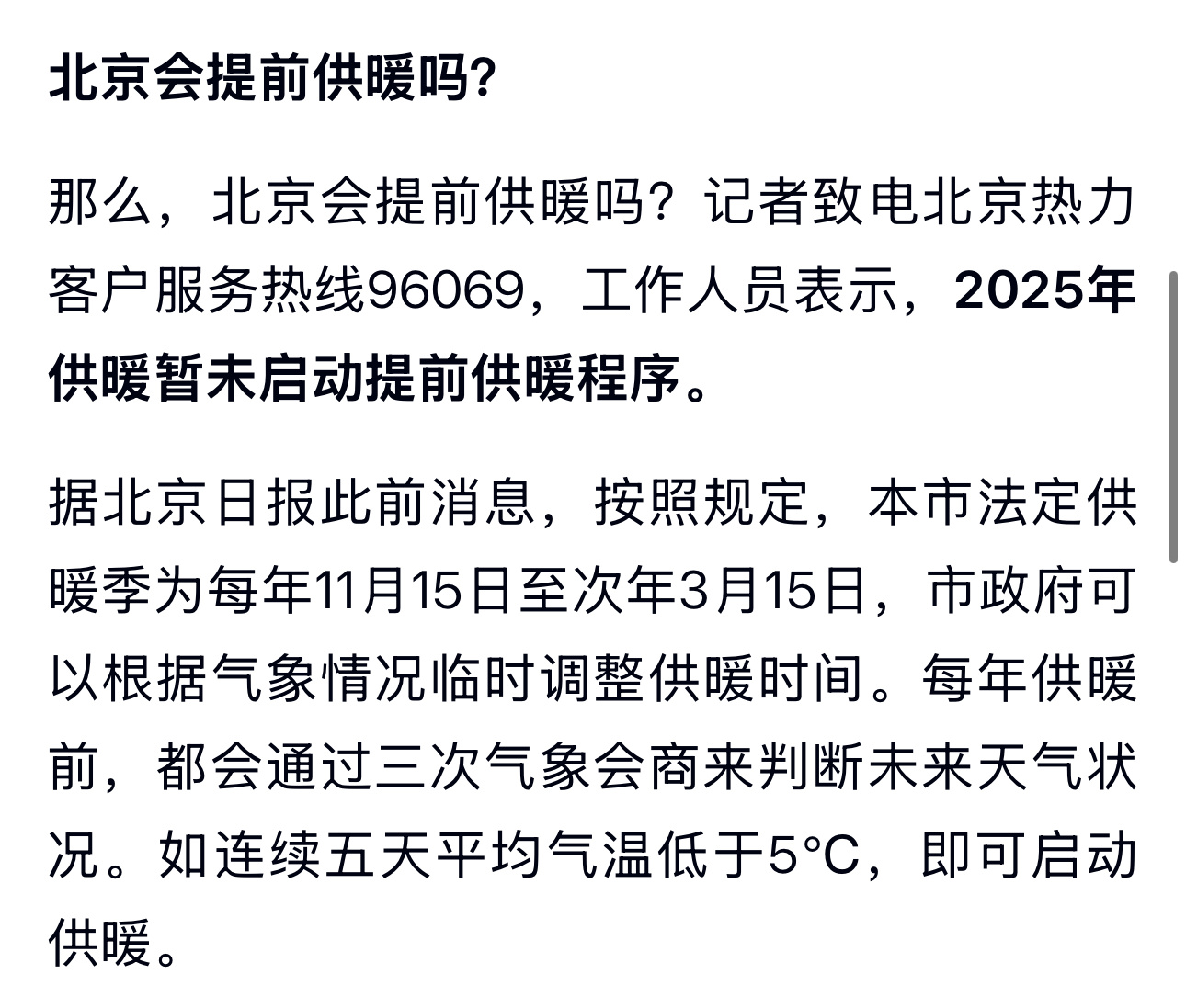 北京市供暖季为每年11月15日至次年3月15日,目前没有提前供暖计划[苦涩]