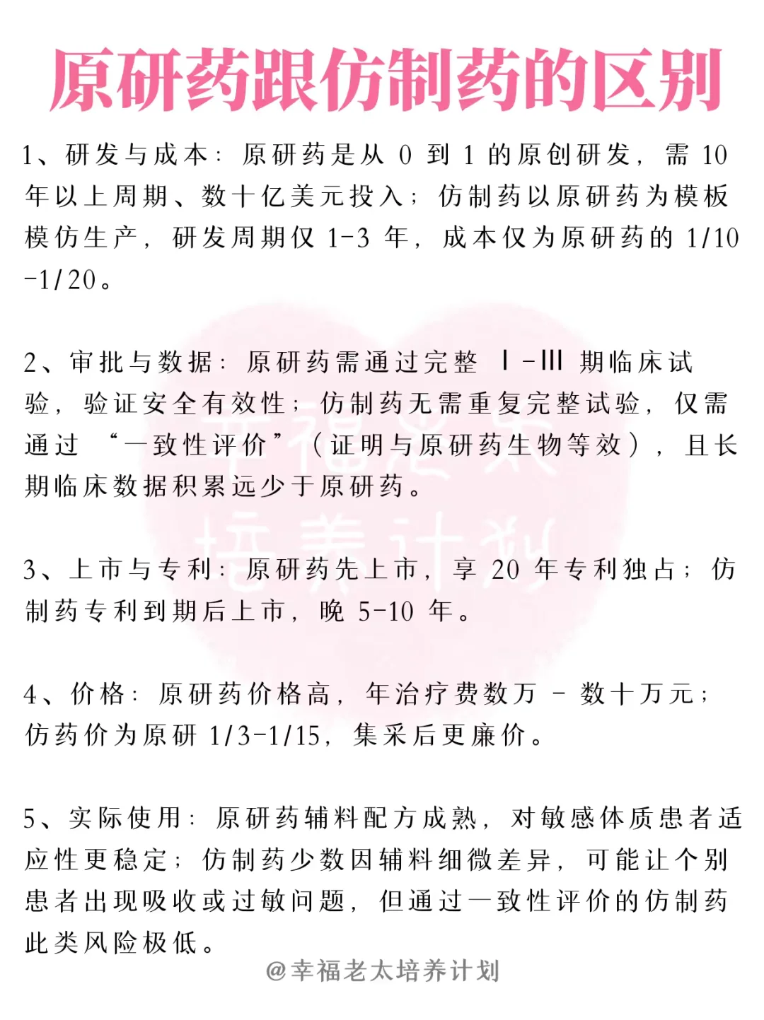➡️ 原研药好比是投入巨大成本研发的“原创正品”,经过层层严格的临床试验,品质和稳定性更有保障。