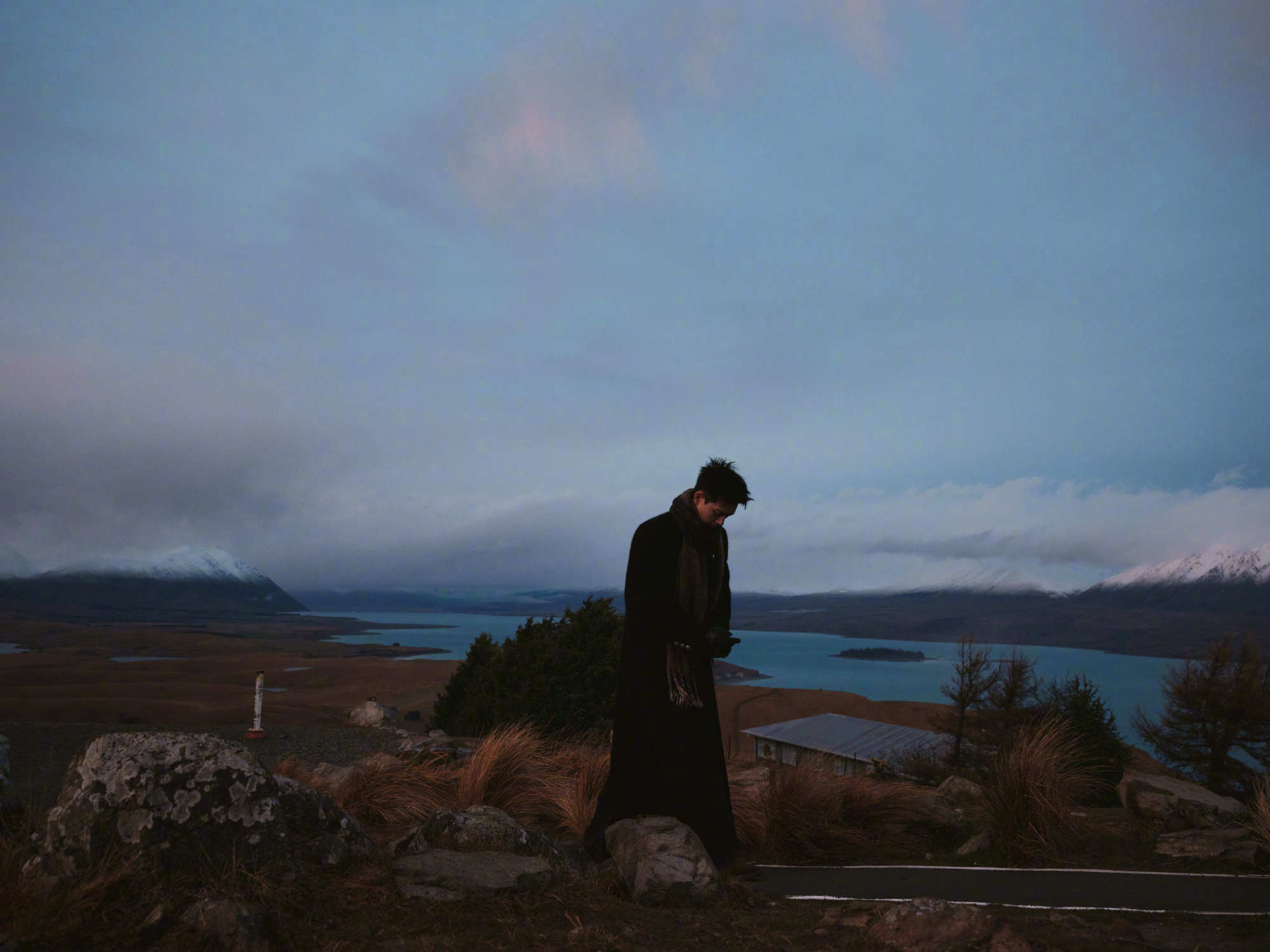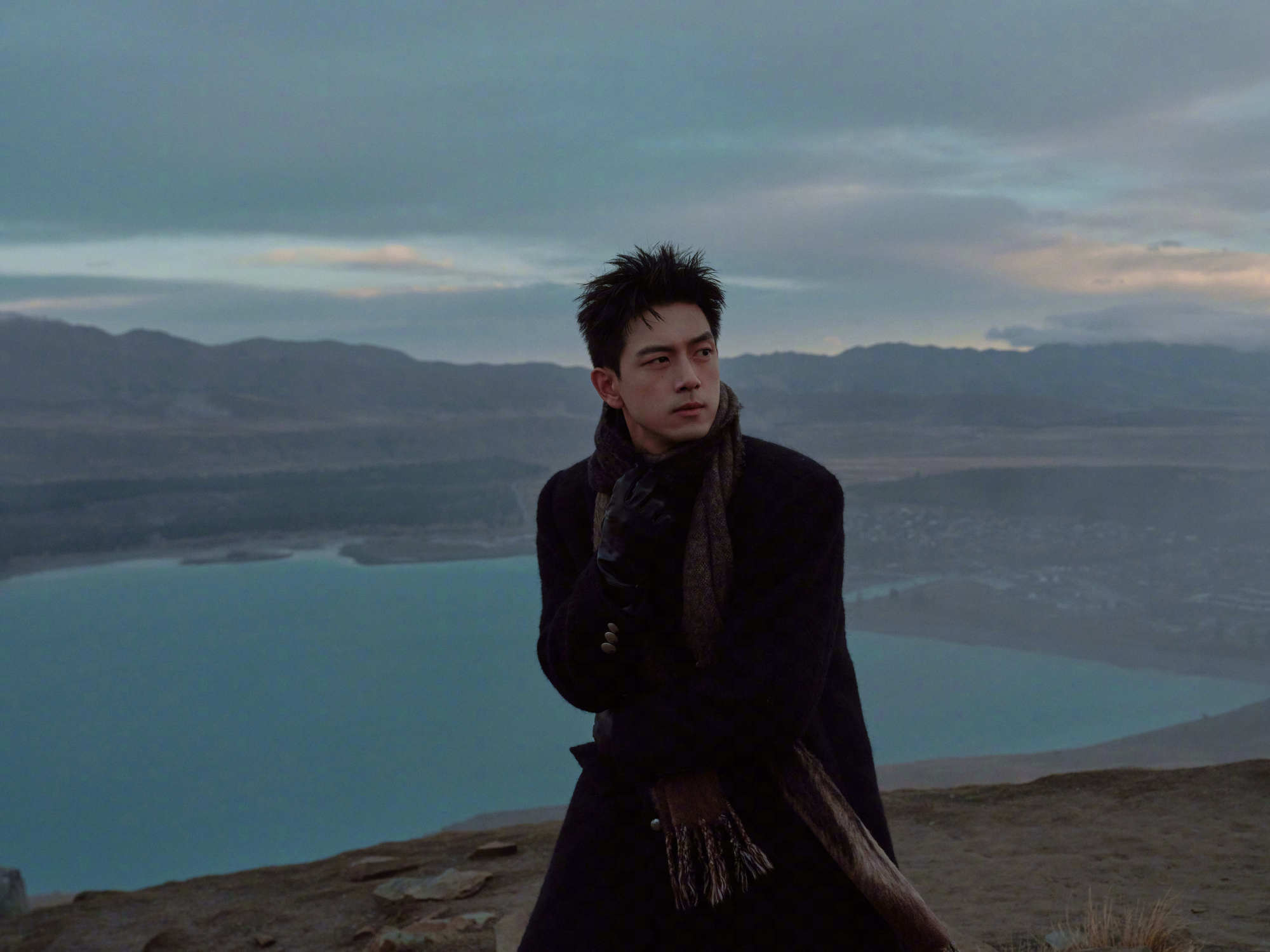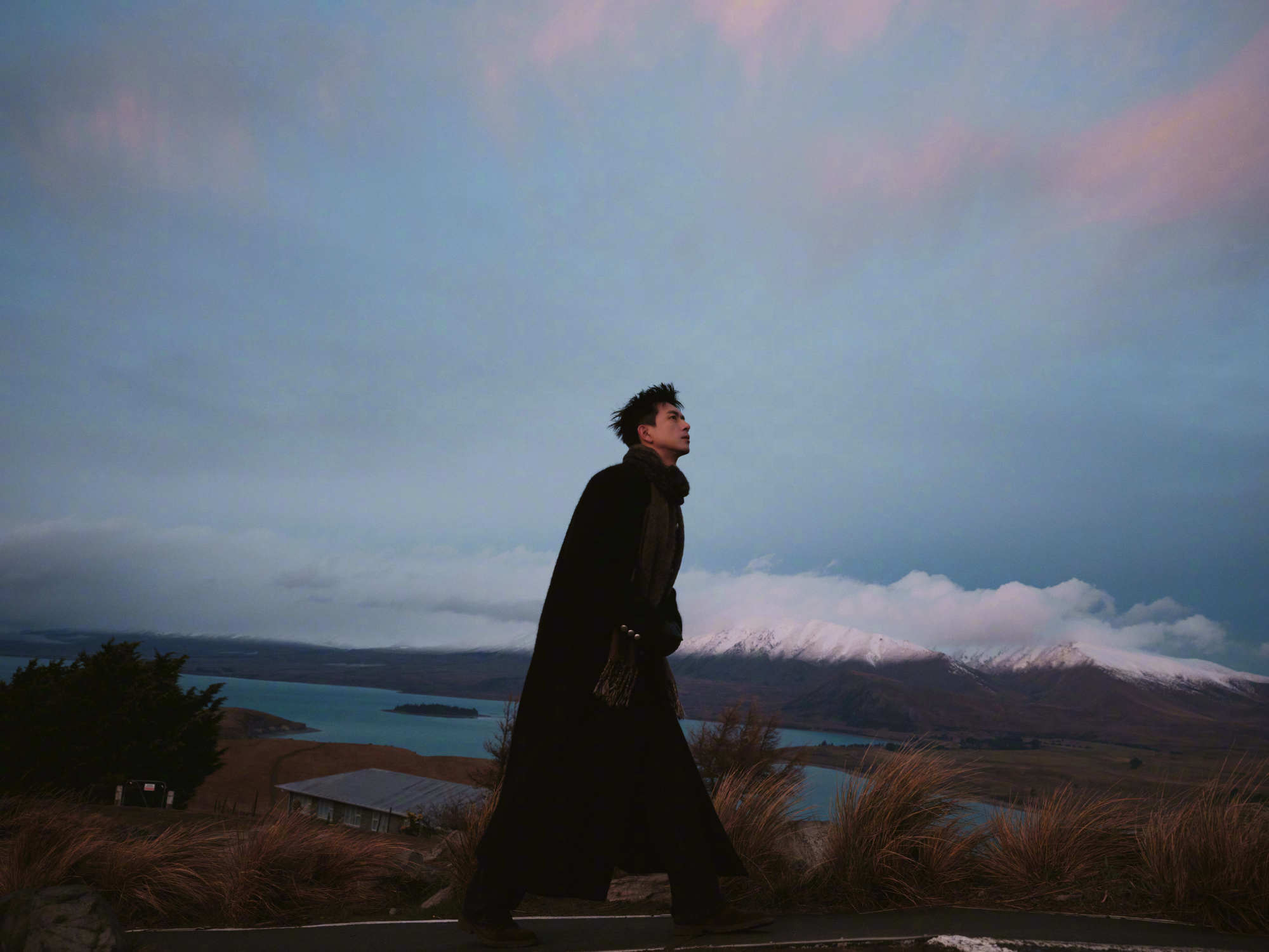 男生穿搭灵感李现新西兰穿搭李现的新西兰穿搭,黑色长款大衣配复古围巾,在湖山间提