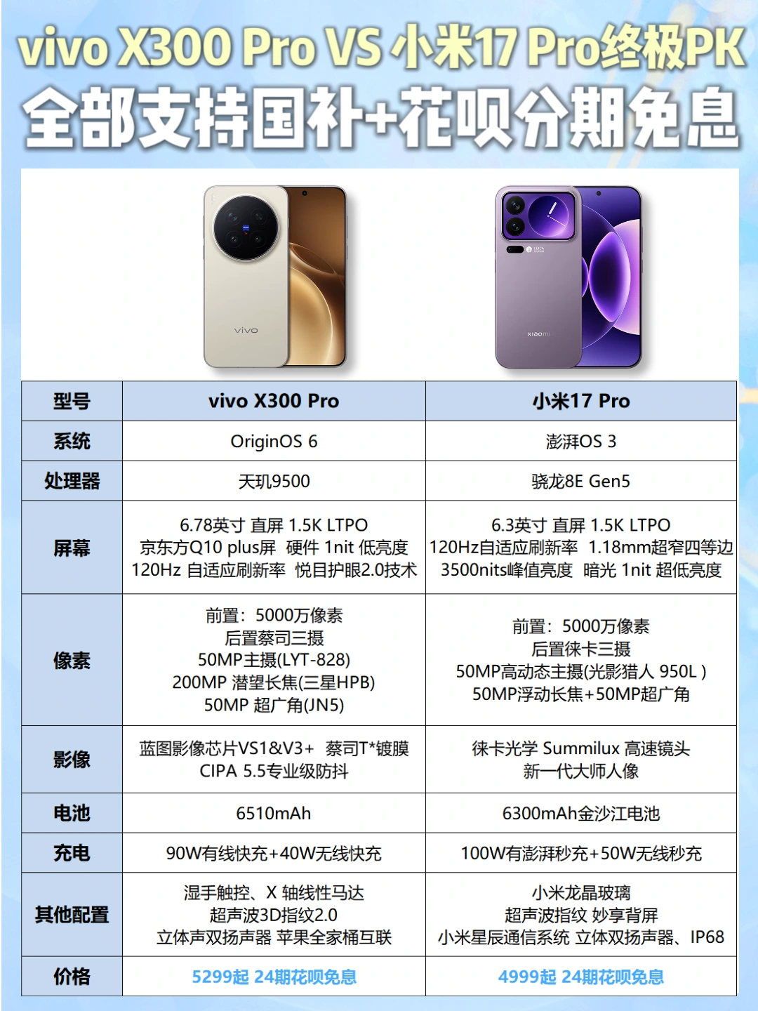 [哇R]眼看双11就开始了,又到了换机国补和花呗分期免息期次最给力的时候,今年的又出了好多新机皇,到底“换哪台手机更香”?[黑薯问号R]今天作为数码老司机,挑出2款热度超高的直屏旗舰——vivo X300 Pro、小米17 Pro,带你精准选机,顺手把钱省到位![黄金薯R]