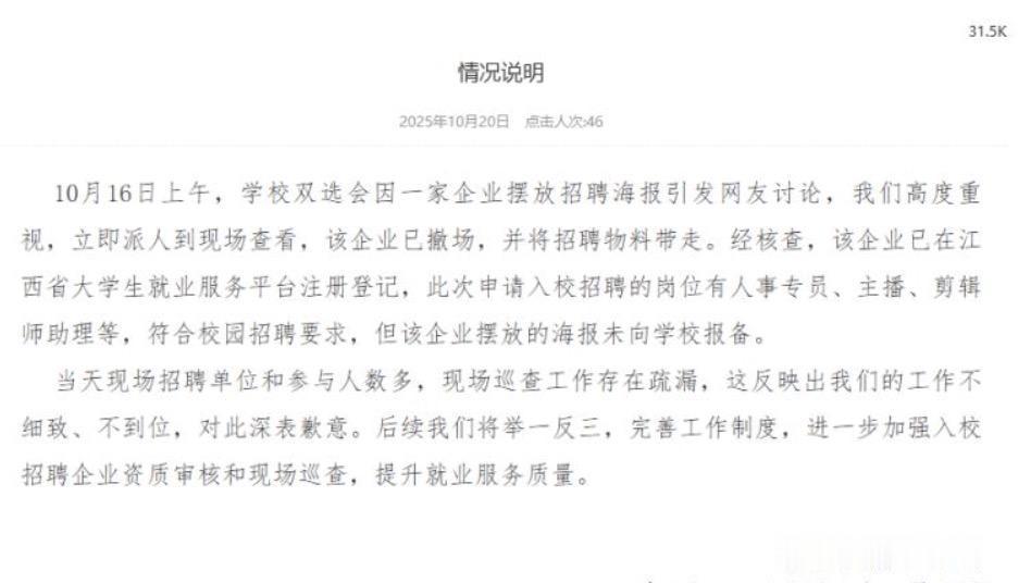 本以为知识能够改变命运,却没想到就算是考上了211高校,毕业后竟然只能当擦边女主播。 最近南昌大学一个秋季双选会火了,事情的起因是一家传媒公司,他们进校园来招聘主播,可在现场竟然贴上了露骨的海报,还要求学生不仅长相好身材好,而且还要有才艺。事情一经曝光之后,尤其是很多人看到,那个露骨的海报之后破防了,纷纷对南昌大学表达不满。南昌大学很快就进行了道歉,并且表示已经责令企业撤场并带走物料。 现在社会不都提倡,大学生要脱掉孔乙己的长衫,不少高材生毕业后,从事快递以及外卖,甚至是收废品行业的,也都有不少,也没见大家如此的不满。可为何却无法容忍传媒公司进校园招女主播呢?事实上大家不是容不下所有的女主播,只是容不下一些擦边的女主播而已。涉事传媒公司,却主打的似乎就是这一类的主播。 其实这家公司,要是社招的话,是一点问题都没有,可校招的话就有点不合适了。虽说现在大学生遍地都是,一些大学也开始没落了,但是人们心中还是对知识有敬仰,大学有尊敬,觉得大学校园是一个神圣之地,这类的企业进校园,尤其是那露骨的海报,就是在践踏校园的神圣。而校园出现这类现象,就是高校在自甘堕落。所以,大家不愿意看到这种现象,更无法容忍这种现象。 原本上一些不得台面的一些女主播,她们露骨的海报堂而皇之出现了211高校的双选现场,是有高校自身资质审核不严的问题,但是从侧面也暴露出了就业形势的问题。尤其是一些本科类院校,毕业等于失业,绝对不是危言耸听。出现这类现象的背后,一方面是因为供过于求,另外一方面也是因为,大学生所学的课程,其实是跟现实脱节了。 企业要求的是实用人才,可一些大学所学的都是一些轻理论的东西,甚至一些理论都是老掉牙的。学这些东西除了增加见闻之外,对于就业是没有太大的帮助。反而是一些专科以及职校的学生,他们在就业上更有优势。因此社会上就出现了反常现象,本科生开始本升专回炉重造。看似是脱掉了孔乙己的长衫,其实是挺可悲的一件事。包括211高校学生,毕业后去当擦边主播也是一样。
