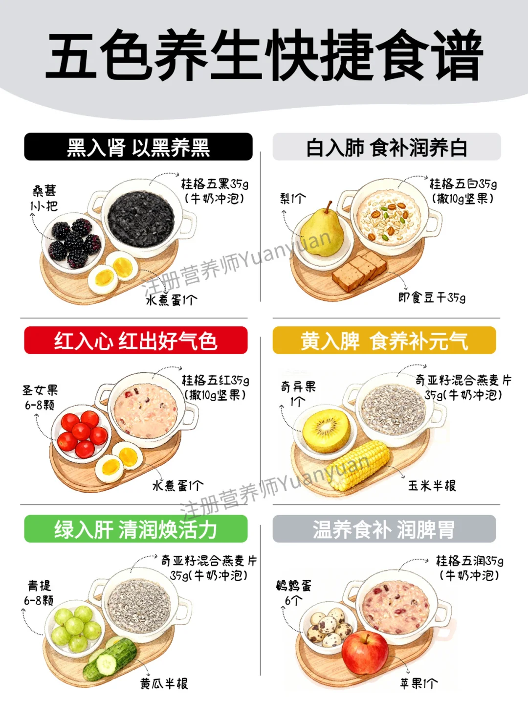 现在秋天天气转凉,我除了桂格五养系列四个口味,还囤了奇亚籽混合即食燕麦片,平时换着吃。就算没时间准备五色食材,也能通过它们吃足营养。我还把自己常吃的快捷养生食谱整理好了,大家可以看图 6
