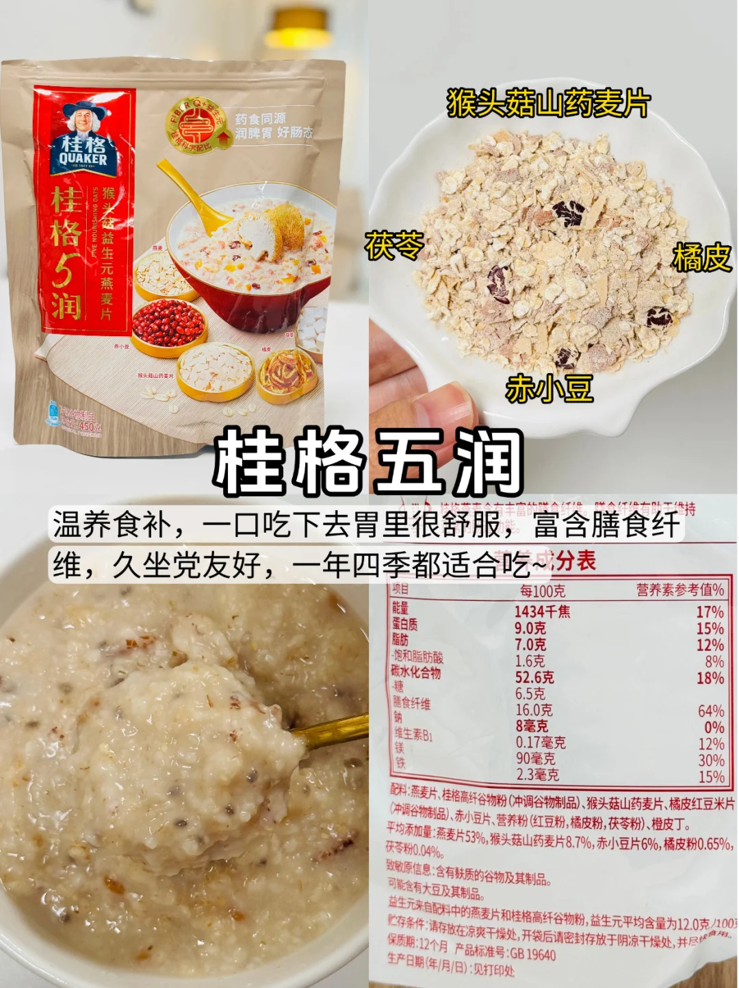 🟡桂格五润:脾胃款,富含膳食纤维,久坐党吃它很合适,一年四季都适合吃~