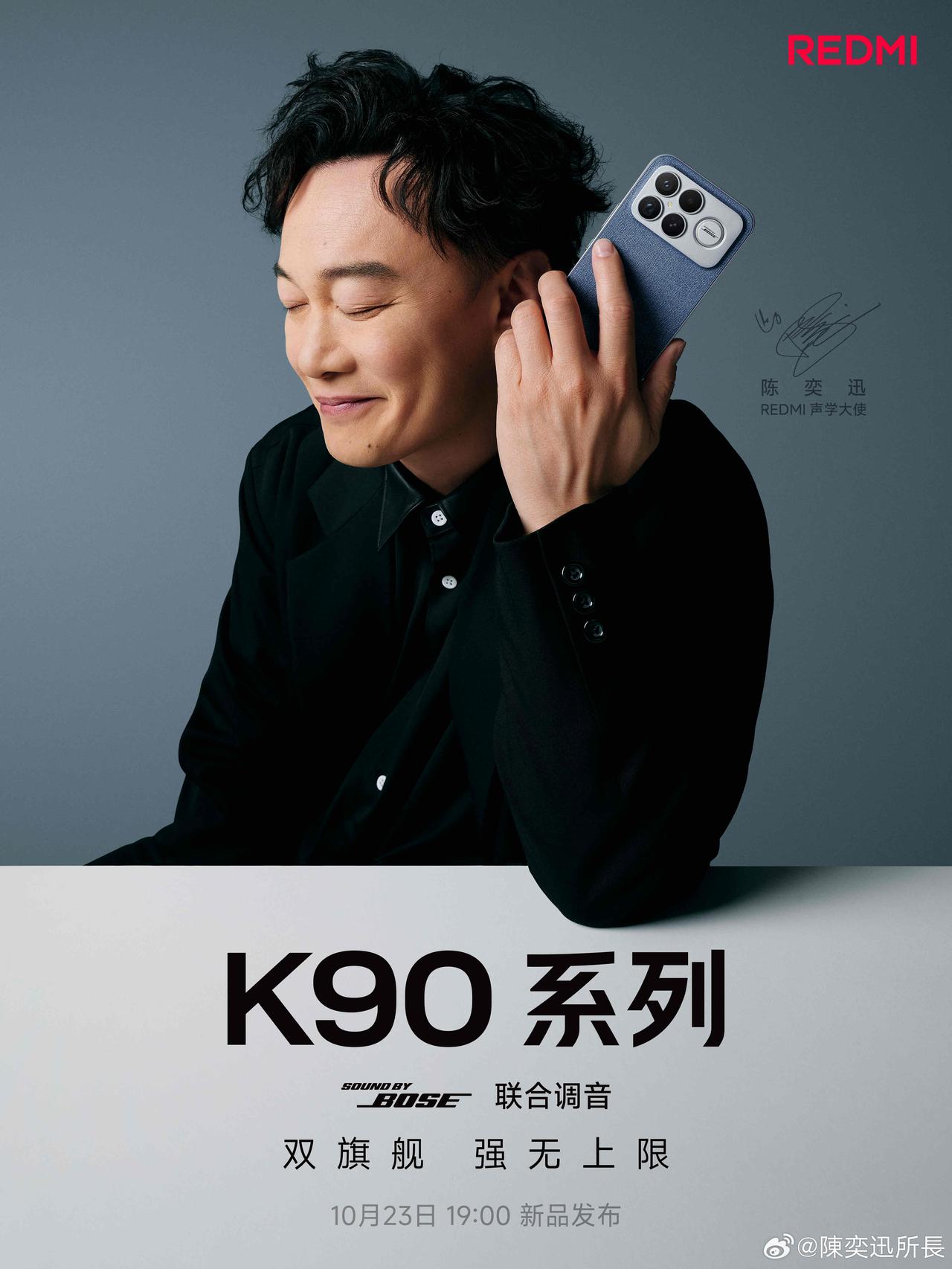 果然是陈奕迅!10月21日,REDMI宣布“新朋友”,陈奕迅出任REDMI声学大使! REDMI K90系列将重点发力“好声音”,K90 Pro Max拥有2.1立体声系统,由两颗超线性扬声器与超大独立低音单元组成,通过携手Bose调音,探索移动声学的新高度。
