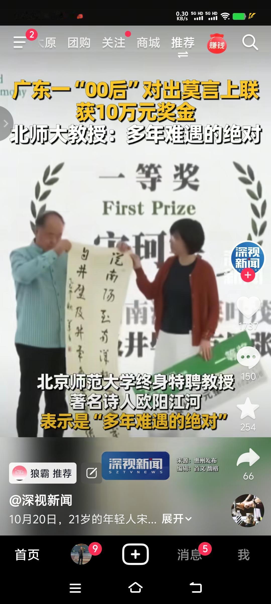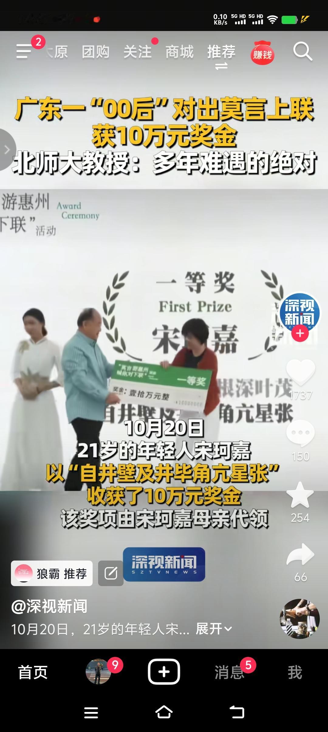 什么是“书中自有黄金屋”,一个字一万,十个字10万。10字下联,奖金10万,00后脱颖而出。 今年六月,莫言在广东惠州百年客家围屋碧港楼有感而发,写下了“从南阳到南洋根深叶茂”的10字上联,并发出向天下文友敬求下联之邀,有工整对出下联者奖金10万。10月20号获奖名单揭晓,21岁的宋珂嘉凭借“自井壁及井毕角亢星张”的下联夺得一等奖。 四个月时间,甚至不到一刻钟时间,10万元轻松拿下,这就是读书的魅力。读书世界就在眼前,不读书眼前就是世界。