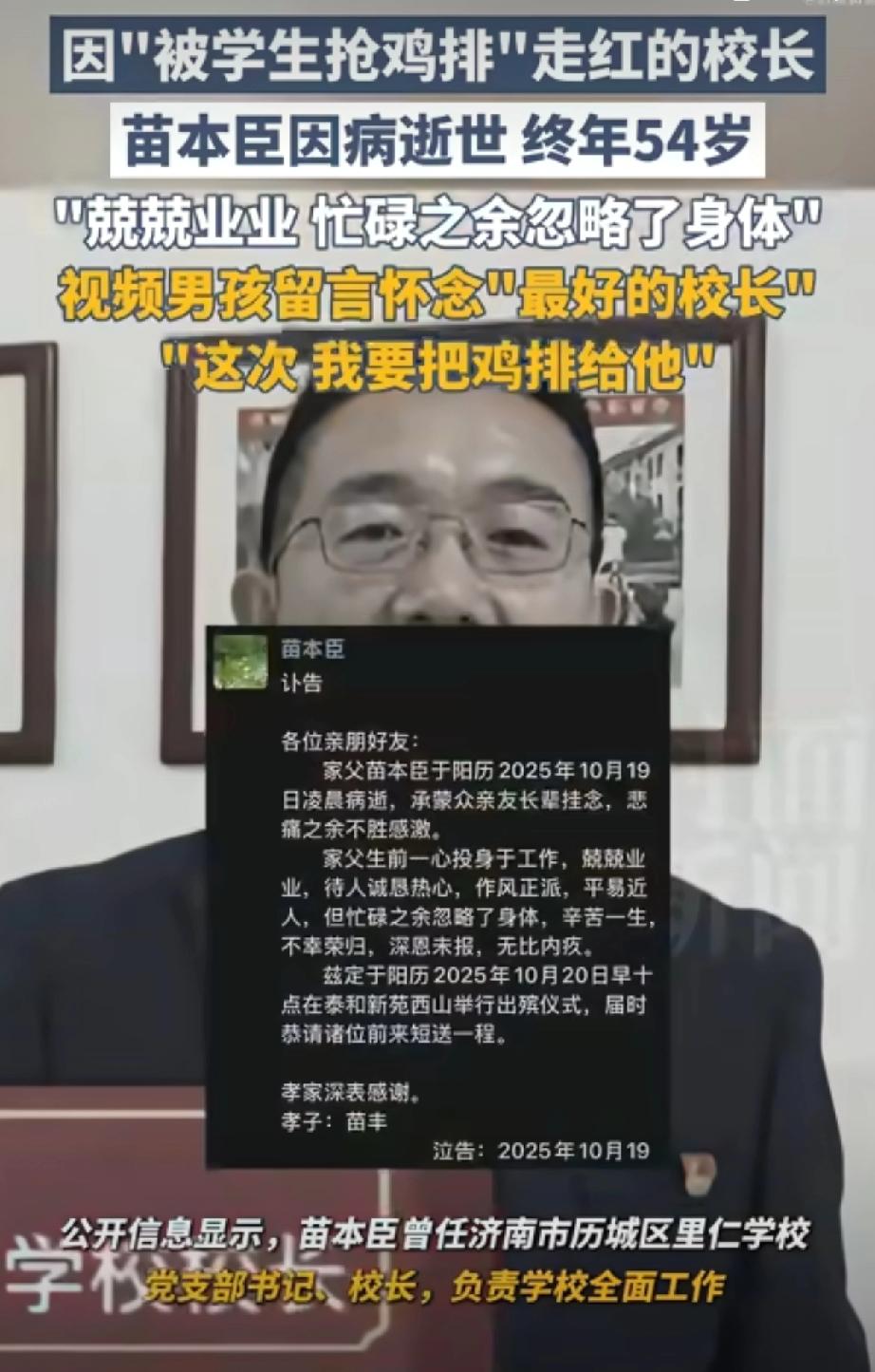 真的没想到,那个和学生“抢鸡排”的济南里仁学校的苗本臣校长,突然就离开了。 10月19日凌晨,他因病去世,才54岁。 消息来得太突然,很多家长和学生到现在都缓不过神。 苗校长是那种你一眼就能记住的教育者。 2022年一段视频让他意外走红:学生假装问他“吃鸡排吗”,顺手从他餐盘里夹走一块,他笑着反问“吃粽子吗”,结果粽子也被学生“抢”了。 这种幽默平等的互动,当时被全网疯传,好多人说“这校长真不一样”。 但视频里的轻松,背后是他长期的付出。 家长回忆,他几乎每天早晨都站在校门口迎接学生,风雨无阻。 有家长留言:“以后再也看不到那个身影了,心里堵得慌。” 而视频里那个“抢鸡排”的男生,得知消息后发文说:“这次,我要把鸡排还给他。” 苗校长的离世,让人不得不正视教育者的健康问题。 他儿子在讣告里提到,父亲一心扑在工作上,忽略了身体。 54岁,正是经验最成熟、最能发光发热的年纪,实在太可惜。 其实苗校长留下的,远不止一段走红的视频。 他让师生关系变得像朋友,让校园有了家的温度。 这种平等和信任,恰恰是现在教育里最珍贵的东西。 有人说,校长的餐盘里永远少一块鸡排,但师生的记忆里永远多一份温暖。 或许最好的告别,就是记住他曾经如何温柔地对待每一个孩子。 教育者的生命长度有限,但他们铺的路,能照亮很远的地方。
