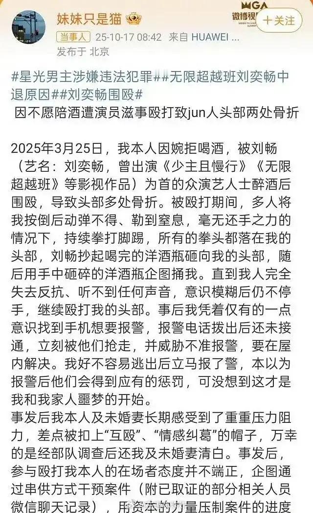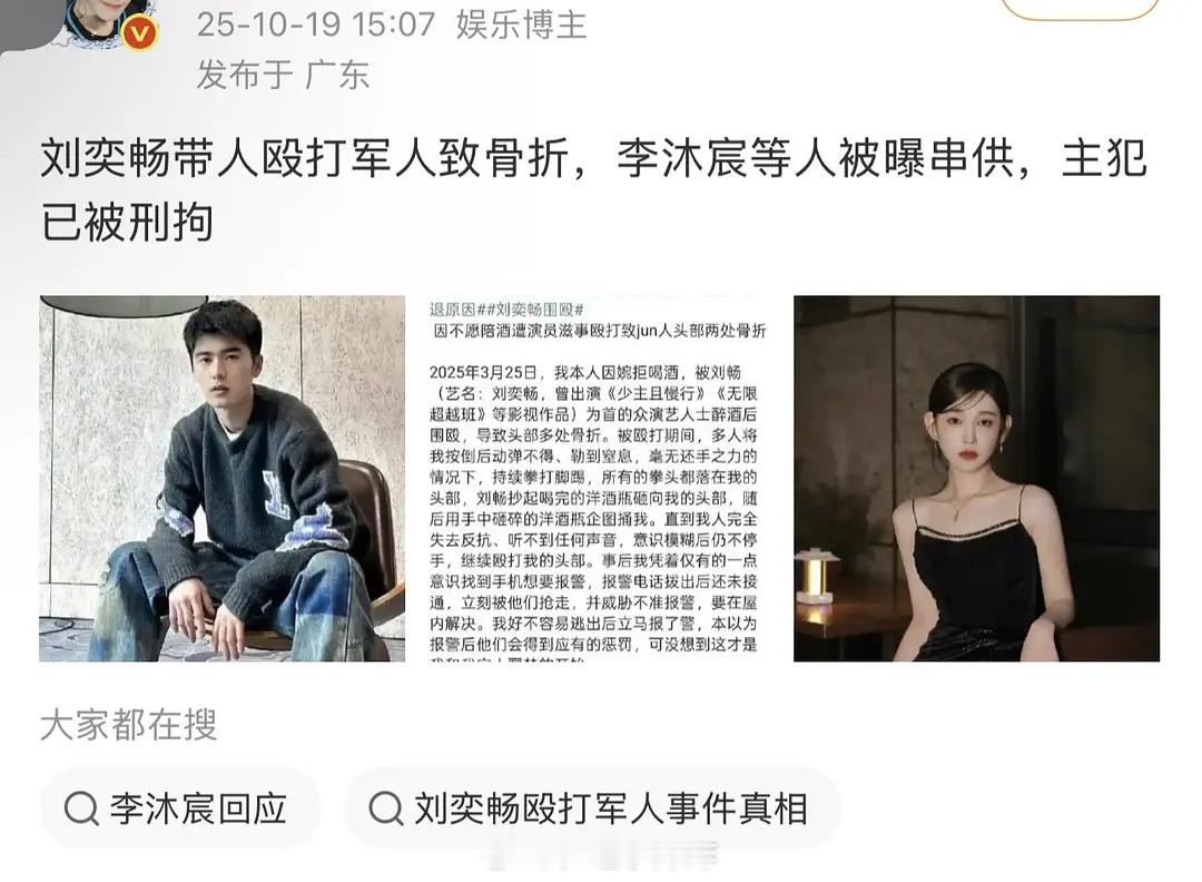 内娱又一个仗糊行凶的刘奕畅带人殴打jun人致骨折3月被抓的,现在放出来还在拍戏
