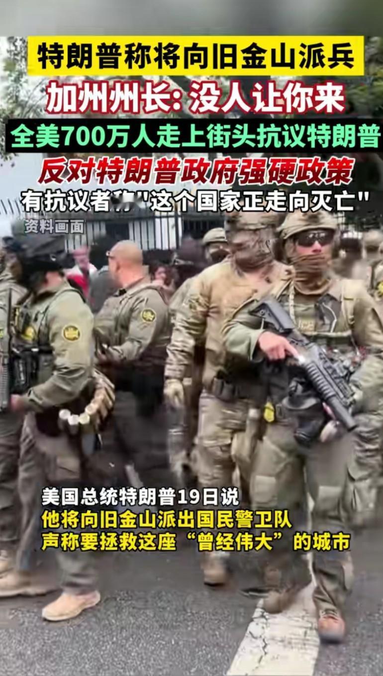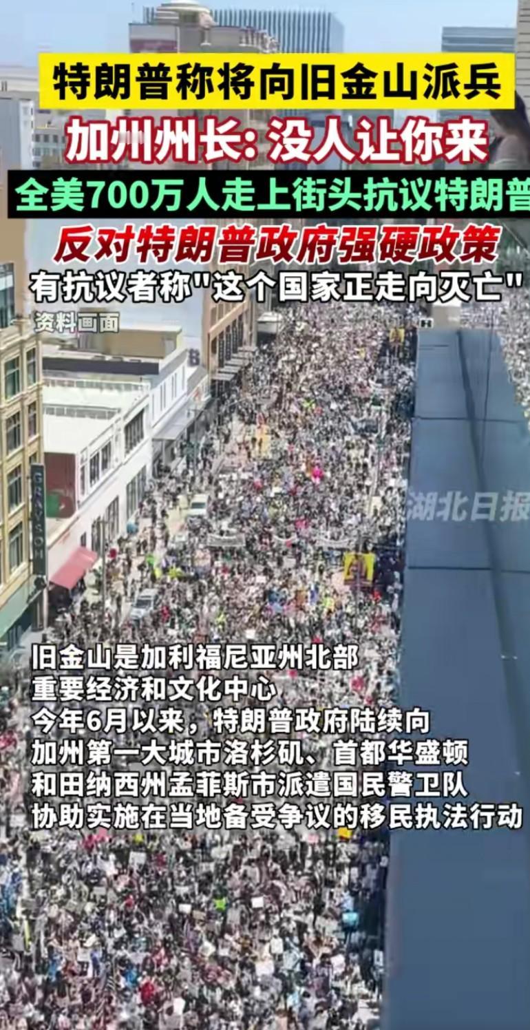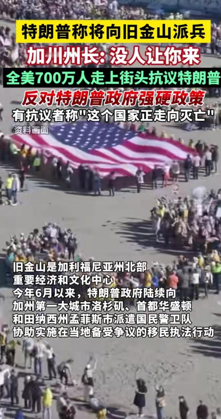 分歧与抗议:特朗普派兵计划引发的全美震荡 当特朗普宣布向旧金山派遣国民警卫队时,加州州长加文·纽森的回应简洁而强硬:“没人让你来。” 这简短的一句话,折射出美国联邦与地方、政府与民众之间深刻的裂痕,而全美700万人走上街头的抗议浪潮,更将这场分歧推向了沸腾的顶点。 派兵计划:联邦与地方的权力博弈 旧金山,这座加利福尼亚州北部的重要经济与文化中心,被特朗普称作“需要拯救的曾经伟大的城市”。19日,特朗普高调宣布将向该市派出国民警卫队,声称要“协助实施移民执法”。然而,这一决定立即遭到加州官方的猛烈回击。 州长纽森在社交媒体上直言“没人想让你们来这里”,强硬反驳“旧金山欢迎联邦派兵”的说法。事实上,这并非特朗普政府首次采取此类行动——早在今年6月,国民警卫队就已被陆续派往洛杉矶、华盛顿等城市,协助执行争议巨大的移民政策。联邦政府的“强势介入”,被地方视为对州权的严重侵蚀,权力博弈的火药味愈发浓烈。 街头浪潮:700万人的愤怒呐喊 与政府内部的角力相呼应的,是席卷全美的民间抗议。18日,从纽约到芝加哥,从沿海城市到内陆城镇,约700万美国人涌上街头,举行“不要国王”示威游行。 街道上,抗议者举着“反对暴政”“这个国家正走向灭亡”的标语,呐喊声震彻云霄。他们反对特朗普政府在移民、关税、教育等领域的强硬政策,认为这些政策撕裂了社会、背离了美国的多元价值观。人群中,有人高举美国国旗,却并非表达对政府的拥护,而是以这种方式呼唤“真正的美国精神”——包容、平等与自由。 裂痕背后:政策争议与民意撕裂 这场风波的核心,是特朗普政府一系列强硬政策引发的信任危机。以移民政策为例,联邦政府的执法行动被许多民众和地方政府视为“不人道”“违宪”,而派兵计划更被解读为“以武力压制异议”。 抗议者口中“国家正走向灭亡”的哀叹,折射出深层的社会焦虑:当联邦权力强行碾压地方自治、当政策分歧演变成街头对抗,美国社会的裂痕正以肉眼可见的速度扩大。旧金山的派兵争议,不过是这道裂痕上最新的一道印记。 从加州州长的公开叫板,到700万民众的街头怒吼,特朗普政府的派兵计划如同一块巨石,投入本就波涛汹涌的美国社会之湖,激起的不仅是政治层面的对抗,更是民意深处的剧烈震荡。这场关于权力、政策与价值观的博弈,仍在持续改写着美国的社会图景。