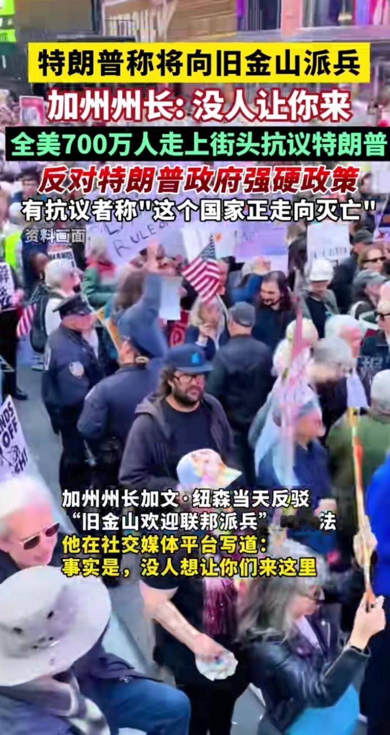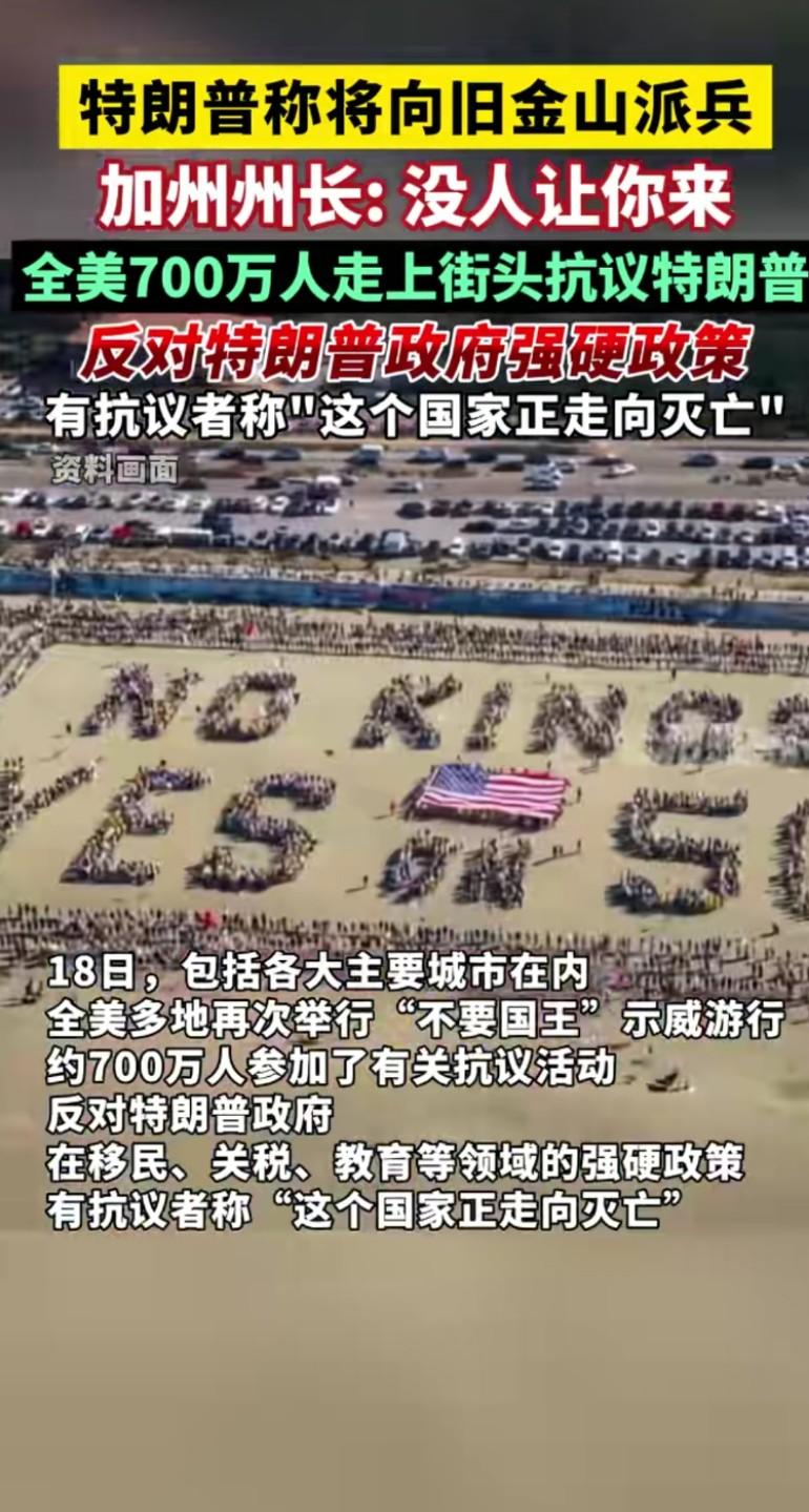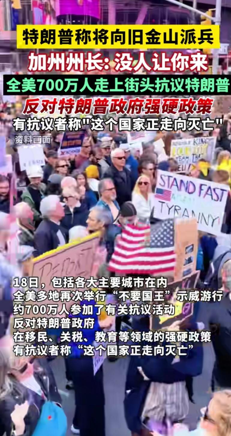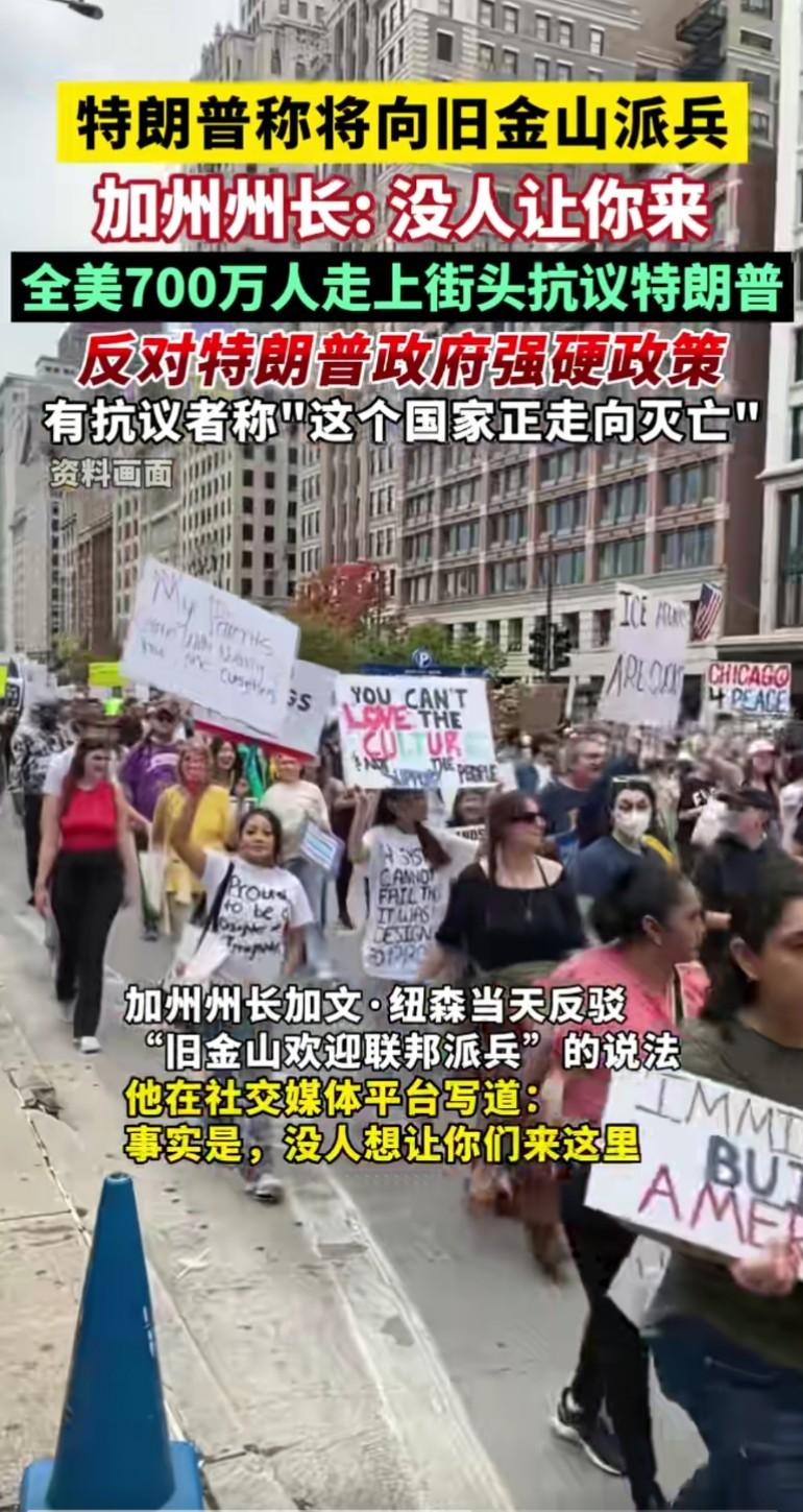 分歧与抗议:特朗普派兵计划引发的全美震荡 当特朗普宣布向旧金山派遣国民警卫队时,加州州长加文·纽森的回应简洁而强硬:“没人让你来。” 这简短的一句话,折射出美国联邦与地方、政府与民众之间深刻的裂痕,而全美700万人走上街头的抗议浪潮,更将这场分歧推向了沸腾的顶点。 派兵计划:联邦与地方的权力博弈 旧金山,这座加利福尼亚州北部的重要经济与文化中心,被特朗普称作“需要拯救的曾经伟大的城市”。19日,特朗普高调宣布将向该市派出国民警卫队,声称要“协助实施移民执法”。然而,这一决定立即遭到加州官方的猛烈回击。 州长纽森在社交媒体上直言“没人想让你们来这里”,强硬反驳“旧金山欢迎联邦派兵”的说法。事实上,这并非特朗普政府首次采取此类行动——早在今年6月,国民警卫队就已被陆续派往洛杉矶、华盛顿等城市,协助执行争议巨大的移民政策。联邦政府的“强势介入”,被地方视为对州权的严重侵蚀,权力博弈的火药味愈发浓烈。 街头浪潮:700万人的愤怒呐喊 与政府内部的角力相呼应的,是席卷全美的民间抗议。18日,从纽约到芝加哥,从沿海城市到内陆城镇,约700万美国人涌上街头,举行“不要国王”示威游行。 街道上,抗议者举着“反对暴政”“这个国家正走向灭亡”的标语,呐喊声震彻云霄。他们反对特朗普政府在移民、关税、教育等领域的强硬政策,认为这些政策撕裂了社会、背离了美国的多元价值观。人群中,有人高举美国国旗,却并非表达对政府的拥护,而是以这种方式呼唤“真正的美国精神”——包容、平等与自由。 裂痕背后:政策争议与民意撕裂 这场风波的核心,是特朗普政府一系列强硬政策引发的信任危机。以移民政策为例,联邦政府的执法行动被许多民众和地方政府视为“不人道”“违宪”,而派兵计划更被解读为“以武力压制异议”。 抗议者口中“国家正走向灭亡”的哀叹,折射出深层的社会焦虑:当联邦权力强行碾压地方自治、当政策分歧演变成街头对抗,美国社会的裂痕正以肉眼可见的速度扩大。旧金山的派兵争议,不过是这道裂痕上最新的一道印记。 从加州州长的公开叫板,到700万民众的街头怒吼,特朗普政府的派兵计划如同一块巨石,投入本就波涛汹涌的美国社会之湖,激起的不仅是政治层面的对抗,更是民意深处的剧烈震荡。这场关于权力、政策与价值观的博弈,仍在持续改写着美国的社会图景。