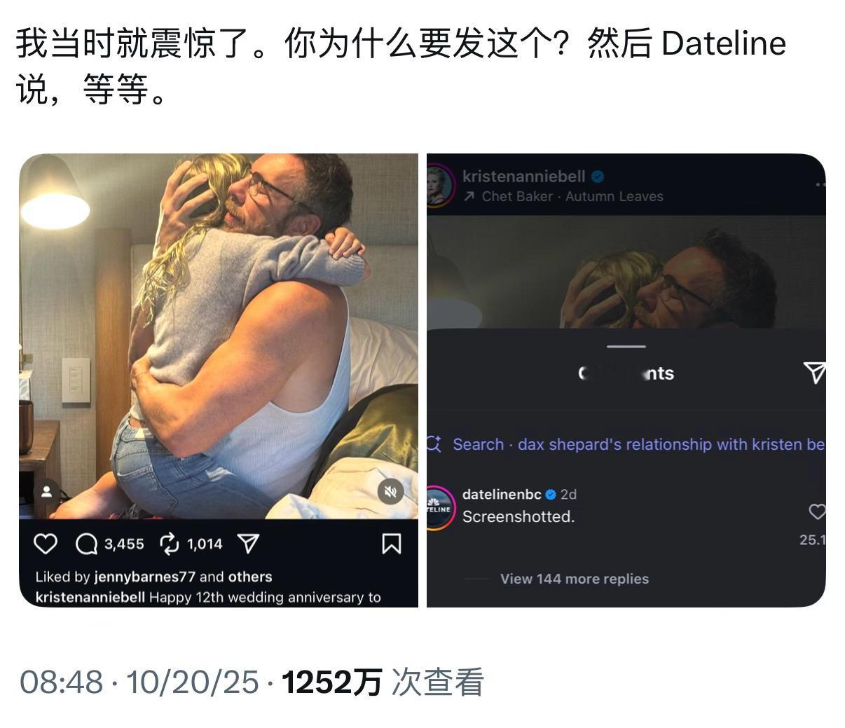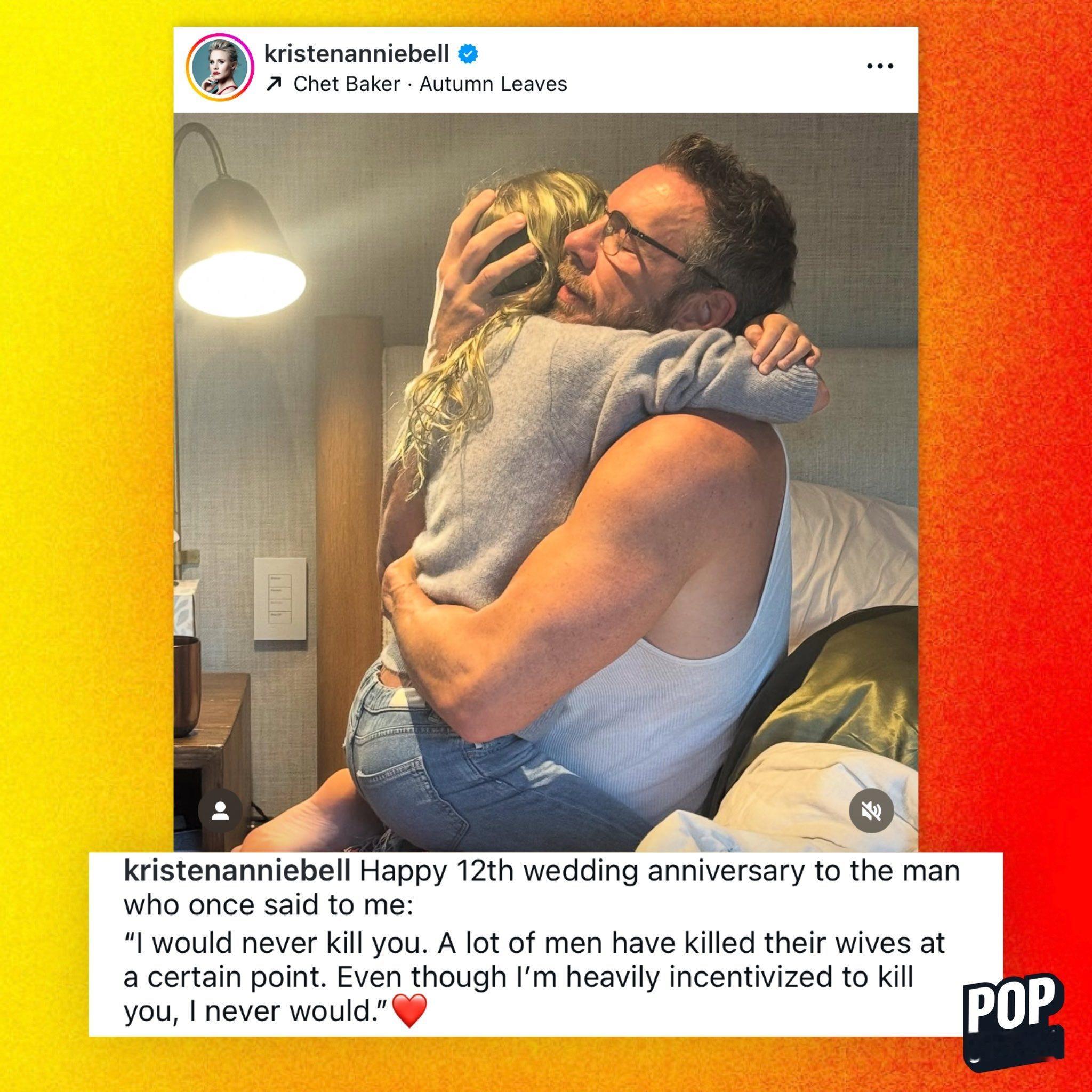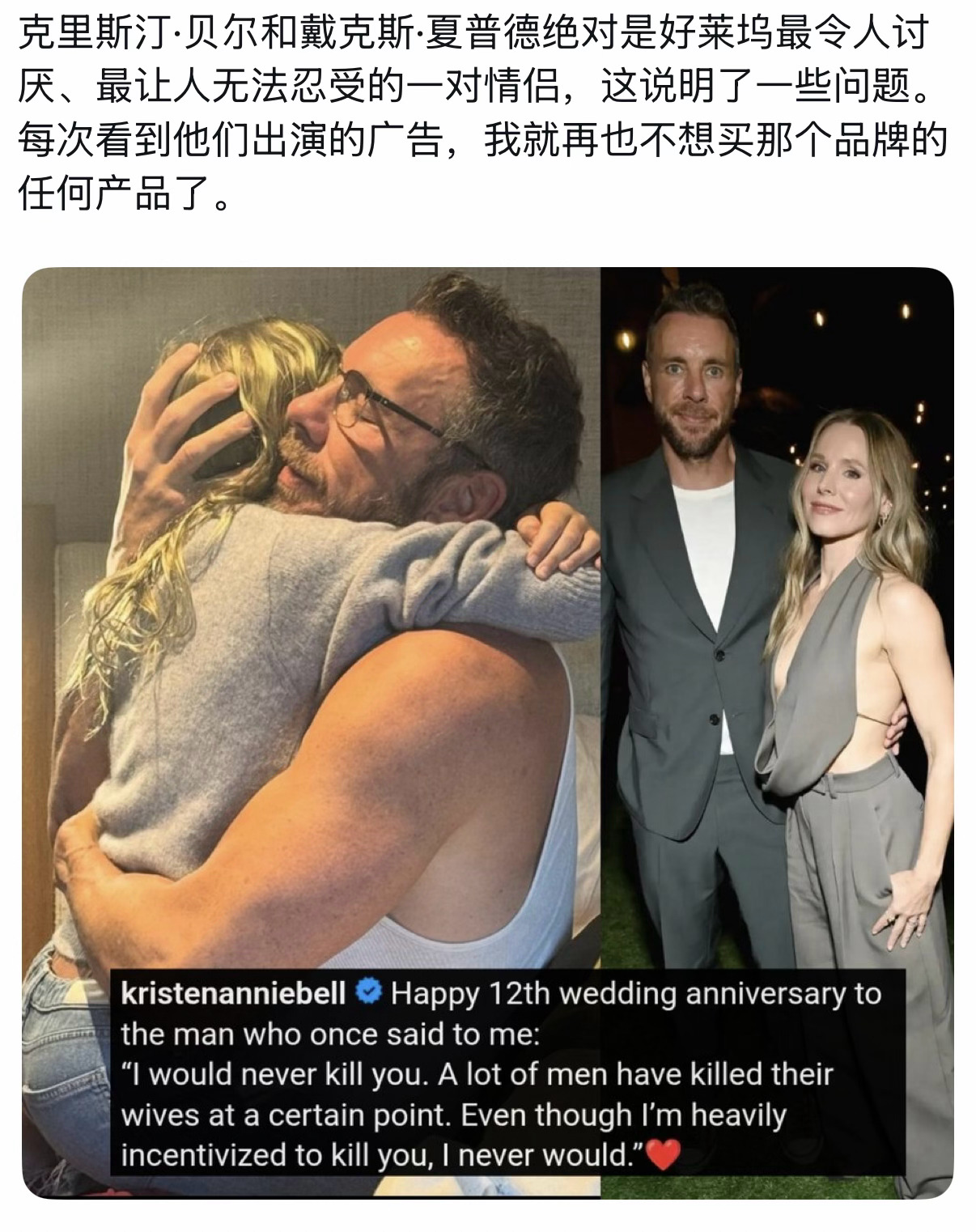 克里斯汀·贝尔在社交平台上发布一张夫妻二人的亲密合照,并写道:「祝我丈夫十二周年纪念日快乐!他曾对我说:“我永远都不会杀你。很多男人在某个阶段都会动了杀妻的念头。虽然我有太多理由想对你下手,但我绝不会这么做。”」