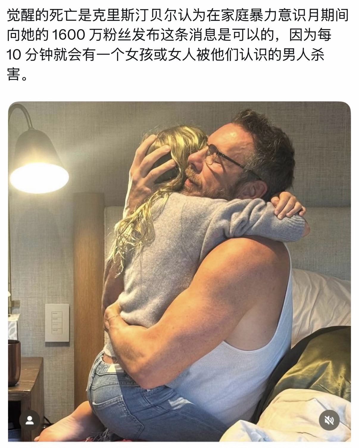 【发生了什么事⁉️】演员克里斯汀贝尔感谢老公不杀之恩遭网友批判全美家庭暴力意识月