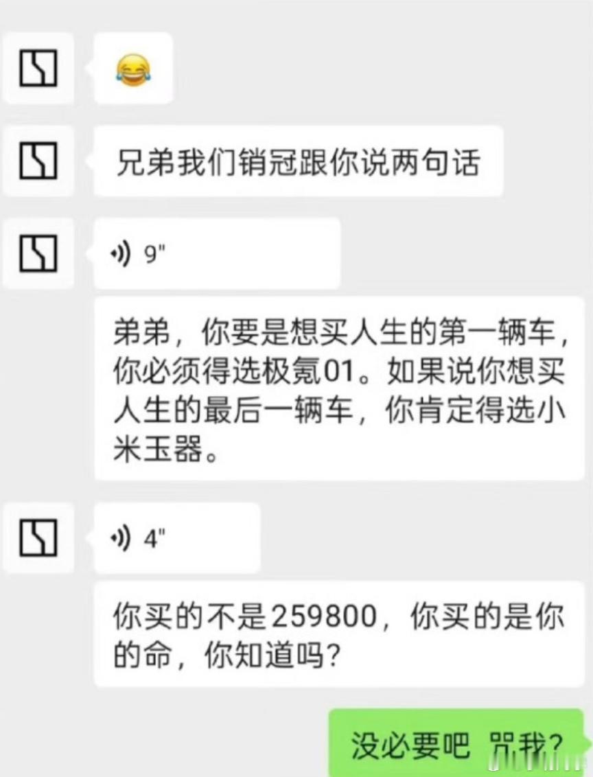 一位22岁的普通消费者在极氪01和小米YU7中决定选择后者,没想到这让极氪的销售直接急眼了,“买人生最后一辆车选小米YU7”这种话也能说出来,这放在十几年前没啥问题,可现在网络时代分分钟就可能成为引战导火索。