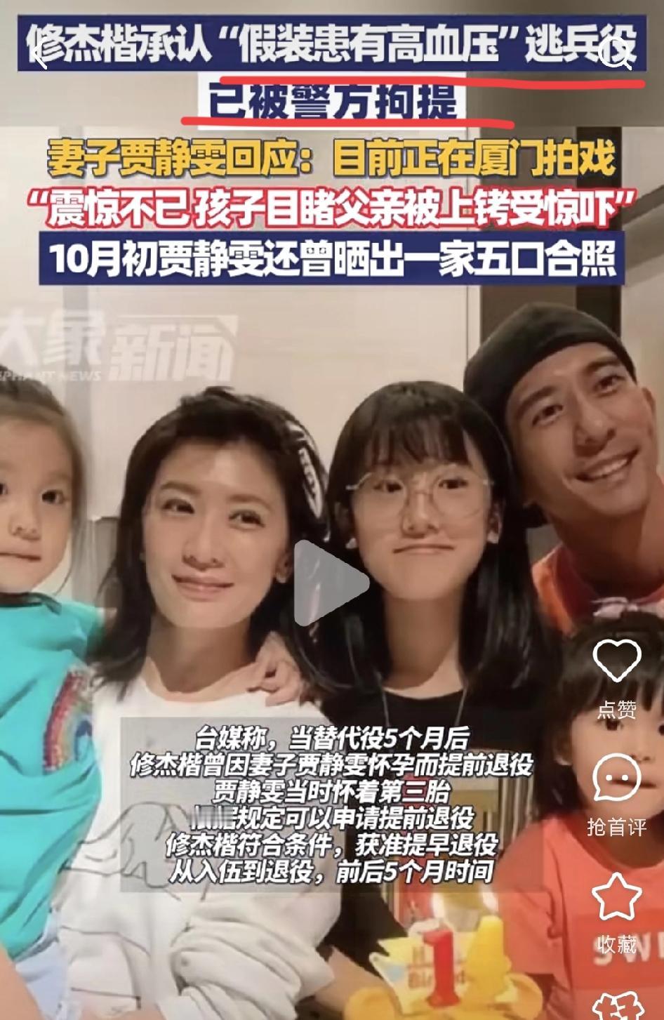 贾静雯生第三胎在2017年,时隔8年修杰楷逃兵役的事被爆了出来,早知如此,花15万新台币假装高血压干啥?还不如乖乖去服役。 贾静雯说老公当着孩子们的面被拷走,孩子们吓坏了。造假的事她大概率是知道的,怨也只能怨抱有侥幸心理,跟王大陆一样以为不会有事。 修杰楷是假装高血压转服替代役,因为贾静雯怀孕替代役也就服了5个月。 偷奸耍滑逃避责任,对规规矩矩按规定办事的人是不公平的。 贾静雯10月初刚过51岁生日,没多长时间老公又被拷走,两次婚姻都较不顺啊! 现在就看修杰楷还有没有别的烂事,只要被查,就不会只查一件事,底子干净的话才不会有更大麻烦。