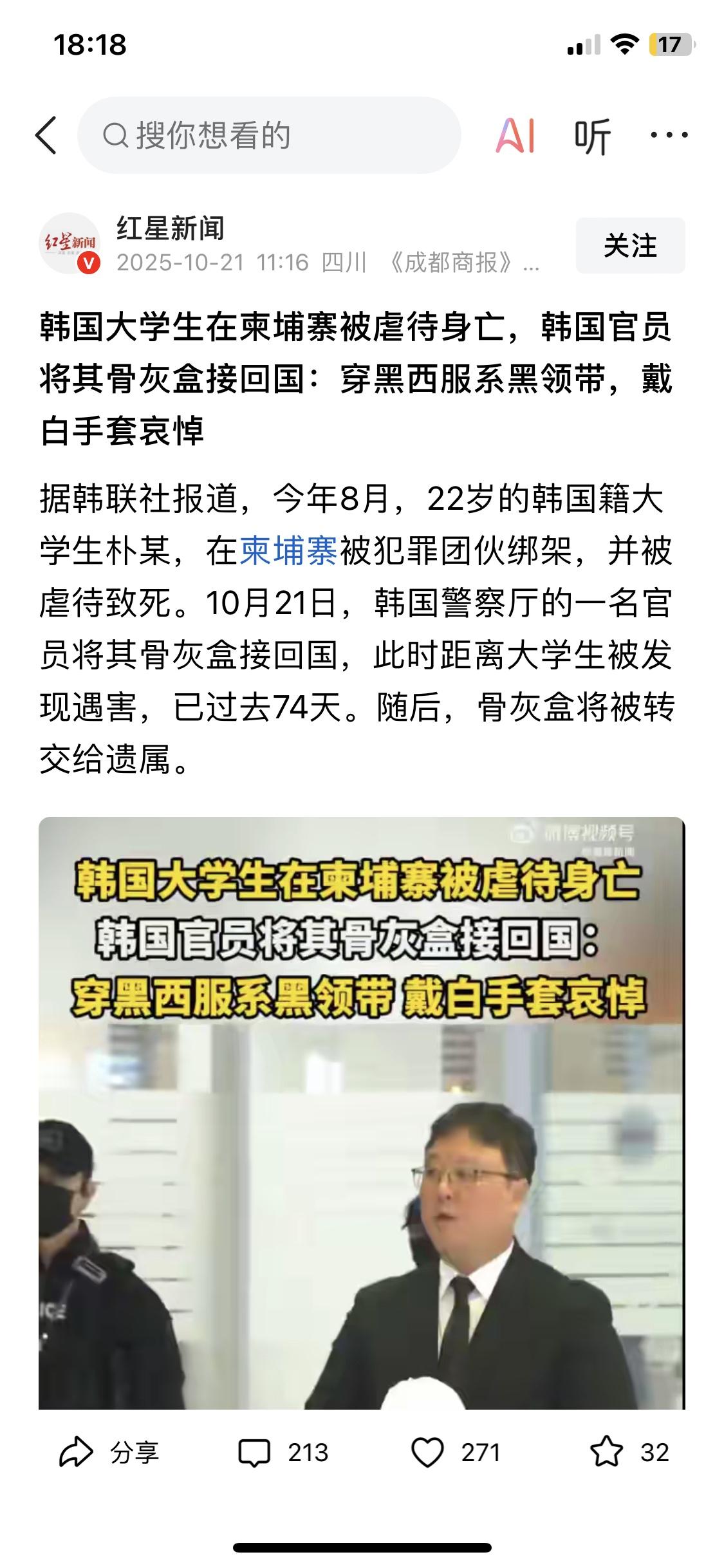柬埔寨园区犯罪集团居然敢去祸害韩国和美国公民,简直是找死。可以肯定随着韩国与美国不断调查遍布东南亚,淡蓝十几年,导致无数人死亡和万亿资金被骗的园区犯罪集团,再也不会被容忍继续存在下去。这是人类现代社会最丑陋和黑暗的集团犯罪行为。