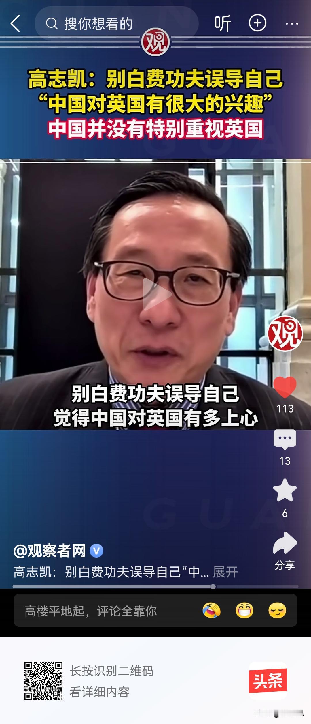 高志凯打脸英国,奉劝他们不要把自己看得太重,别以为中国对英国有多么上心,中国并不