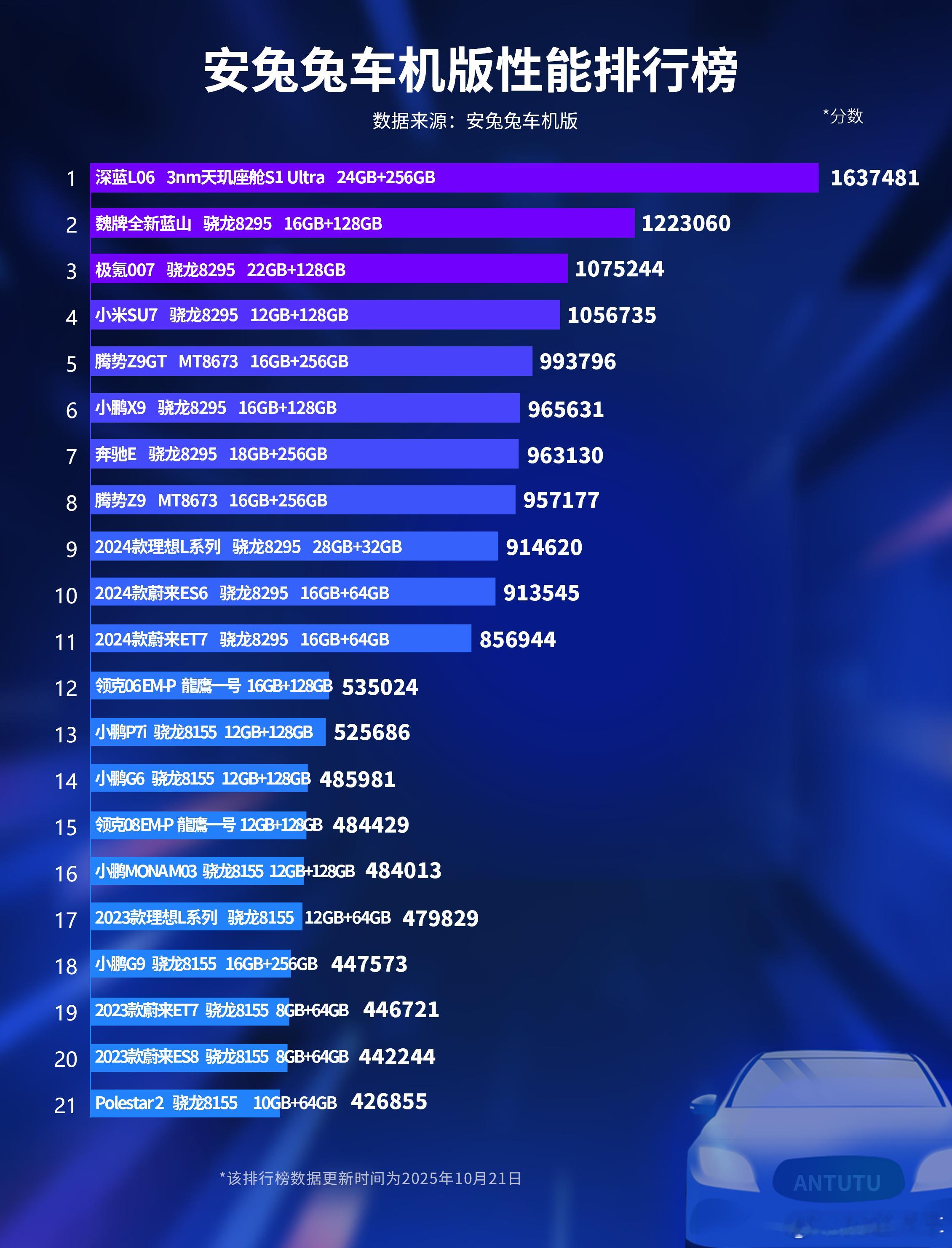 更实用的是,强大的算力支撑起了四图融合实景导航,在智驾辅助时也能提供精准的车道级指引,覆盖城区和高速全场景。所以,深蓝L06这波不止是车机流畅,更是把智能座舱的体验整体带到了新水准,再加上磁流变悬架的加持,软硬件都是百万级的水平,综合实力确实能打。深蓝L06安兔兔跑分第一深蓝L06