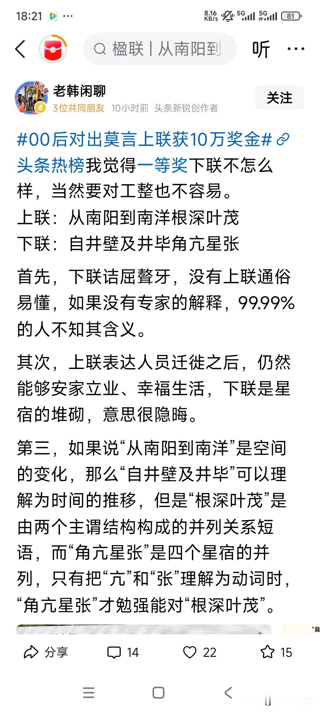 凭什么这一副下联儿能值10万能获得一等奖? 很多人看到零零后所对出来的这一下联儿,表示不是很理解能够获奖。 莫言的上联是:从南阳到南洋根深叶茂。 而对出来的下联:是从井壁到井毕角亢星张。 这个项链对的确实很拗口,也很一般,看不出什么出彩的地方。 尤其是根深叶茂,是属于主谓短语。而角亢星张是属于并列短语。这个下联,除了符合仄入平收的规则,对的漏洞百出。 严重怀疑这个00后是评委会的人家的亲戚!对联神回复 神级下联