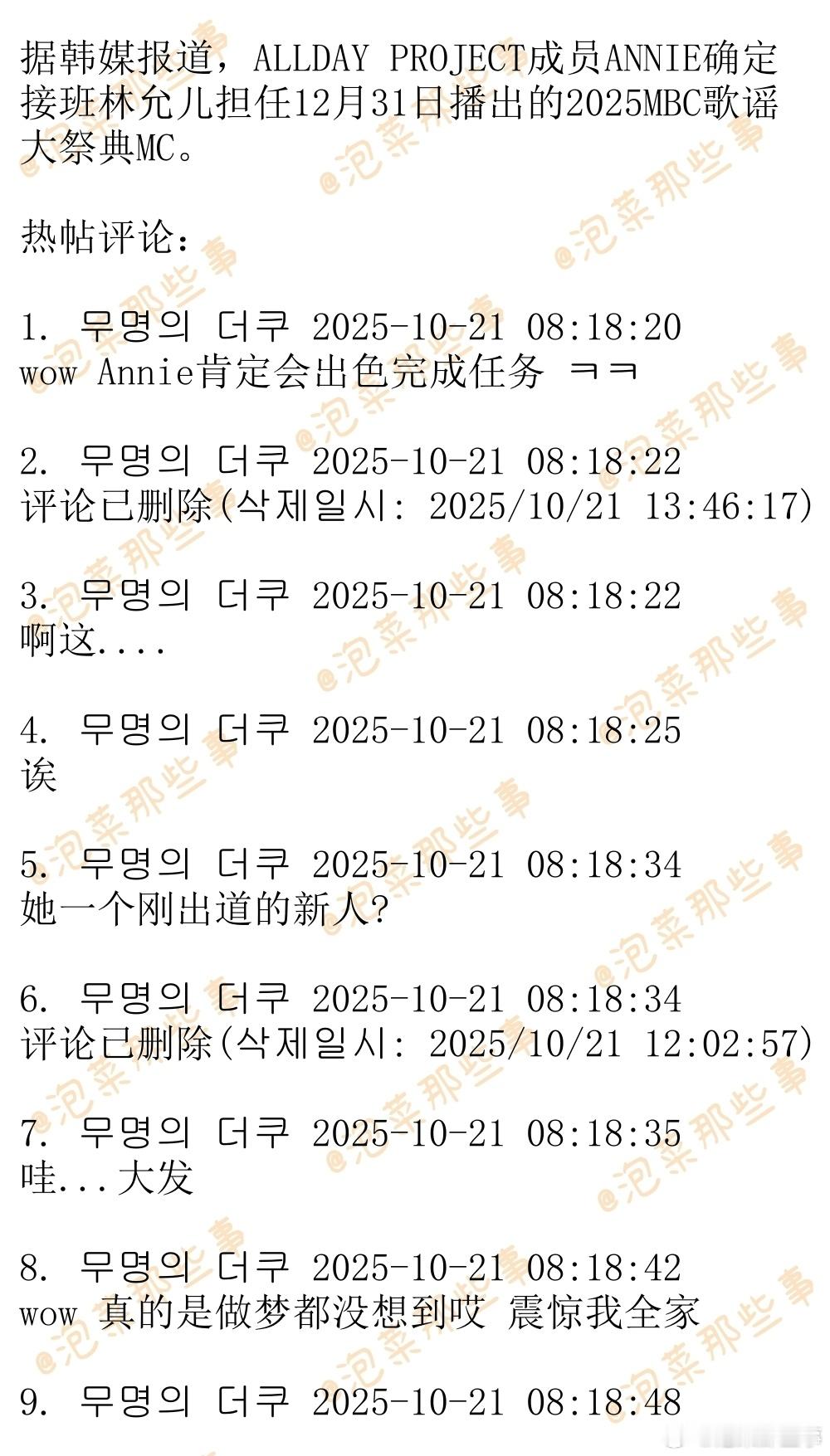 据韩媒报道,ALLDAY PROJECT成员ANNIE确定接班林允儿担任12月31日播出的2025MBC歌谣大祭典MC。