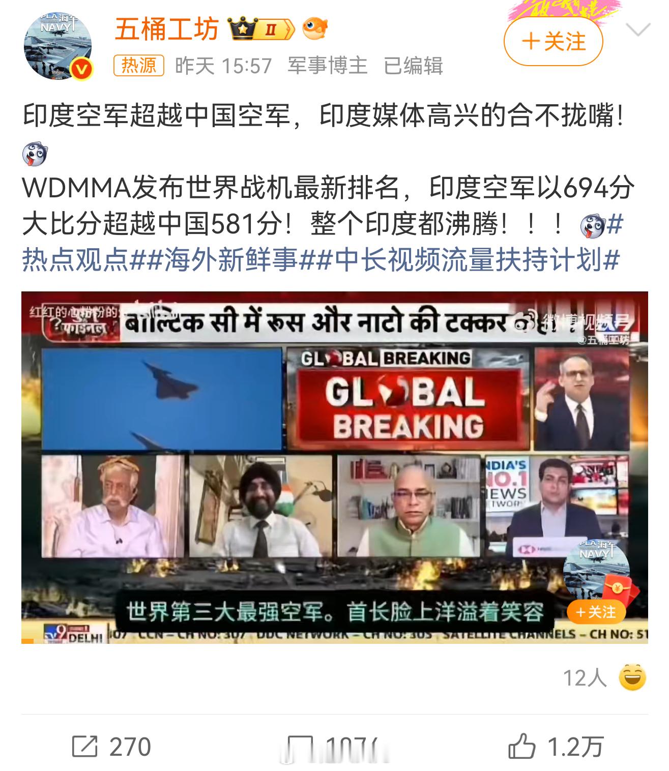 印度空军超越中国印媒沸腾了美国智库的含金量,印度智库的脑容量,超级加倍的大赢特,这其实是好事,看到两国如此,我也就放心了