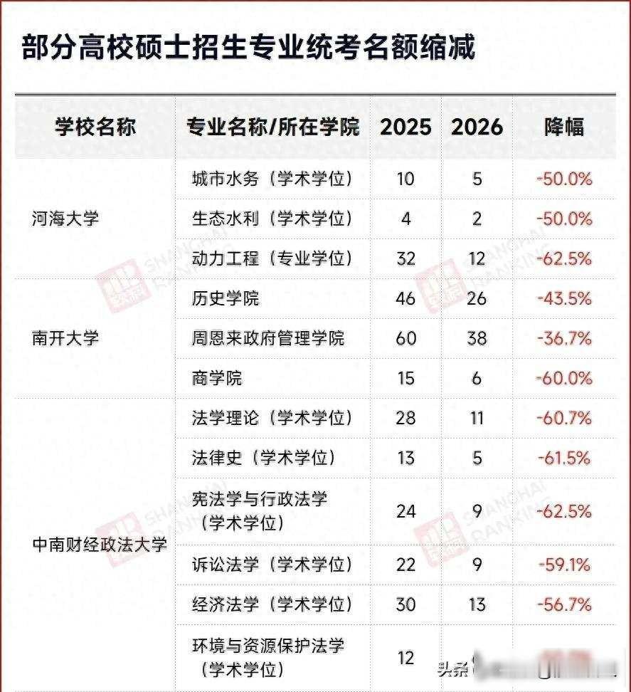 考研缩招?保研抢位,你被挤出赛道了吗? 2024到2025年,好多学校硕士招生名额都变了,河海大学三个专业统考名额少了二十七个,中南财经政法大学法学院六个专业直接砍掉七十六个,南开大学一口气删了五十一个统考名额,有人发现一个985学校的计算机专业总名额多了十四人,但保研多占了五十三个,统考反而从一百一十三降到七十六,新传学院也是,总名额加了二十五,保研多拿三十五,统考倒少了十个,你没看错,不是所有专业都在缩,是你报的那个专业,塌了。 很多人以为学校不招生了,其实不是,总人数没少,还在增加,问题是保研的人越来越多,教育部这几年一直推保研改革,鼓励学校多收本校的优秀学生,2025年不少双一流高校保研率超过五成,计算机、法学、新闻传播这些热门专业,保研比例能到六成以上,统考的名额就这么被一点点挤掉,这不是突然发生的,是政策在悄悄改规矩。 学校偏爱保研生,因为国家希望优秀学生留在本校,方便继续做科研,保研生基础扎实,老师带起来省力,出成果也快,对学校排名有帮助,企业也更认可保研生,导师自然更愿意带自己熟悉的學生,这样一来,保研、留校、读研、找工作就串成了一条路,考研的人夹在中间,日子越来越难。 你为啥觉得全都在缩招呢,没变的学校没人说,一有学校改了数据,网上就吵翻了,网友说得对,落到自己头上就是百分之百,更难的是,考研的人花的时间、精力、钱太多了,有人放弃二本冲985,天天学到半夜,有人为了换考纲,重新买书、重做笔记,几百页资料说没就没了,这些代价没人算,也没人管,保研的路越走越宽,考研的人怎么熬的,没人看见。 2026年考研的考生,现在就得开始盯保研这条路,大一就动手,参加比赛,写论文,找导师,别拖到大三才着急,别选保研人数涨得快的专业,翻翻过去三年的数据,挑保研率低于三成的冷门方向,机会可能更多,也看看新开的专业,比如AI加法律、数字人文这类交叉学科,还没形成固定套路,统考名额还留着不少。 考研现在不是比谁更拼,而是看谁先摸清了门道,没人会告诉你该什么时候换方向,也没人会提醒你哪些专业早就被保研的人占满了,你能做的就是早点打听,早点准备,早点改计划,别等到报名那天才明白,你心想着的专业,早没你什么事了,规则在变,你就得比它快一点。