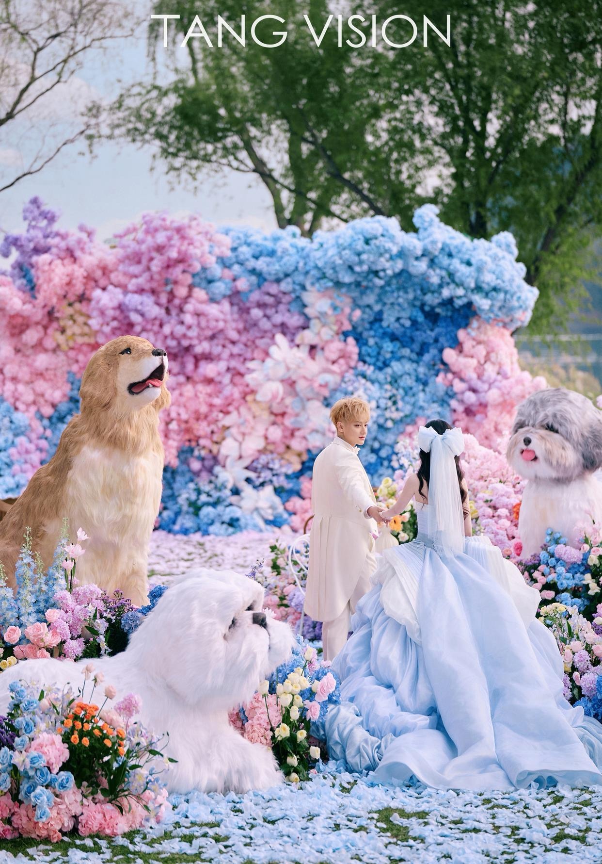 黄子韬徐艺洋喜欢养宠物,把汪星人元素都带进了的婚礼现场。场地摆放了几只巨大的狗狗模型,婚礼流程卡上印着狗狗的图案,就连送戒指环节也是由狗狗代替花童来完成。