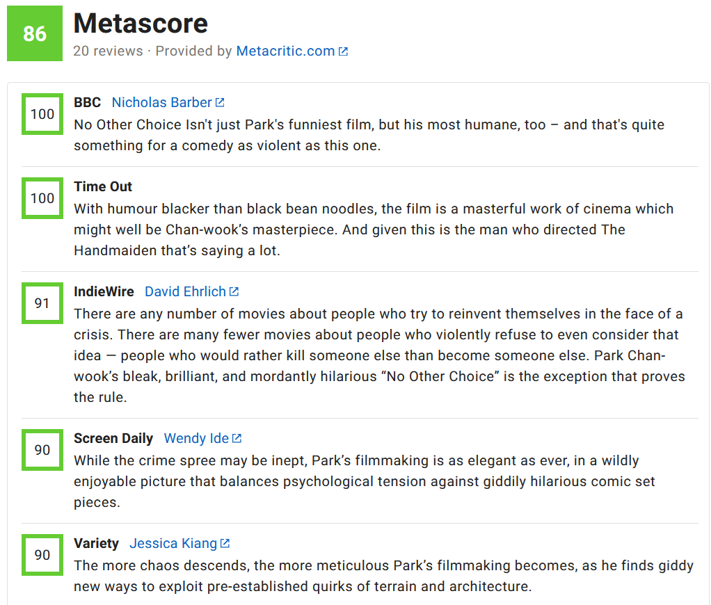 朴赞郁导演新片《无可奈何》烂番茄开分,100%新鲜度,暂时零差评。Metasco