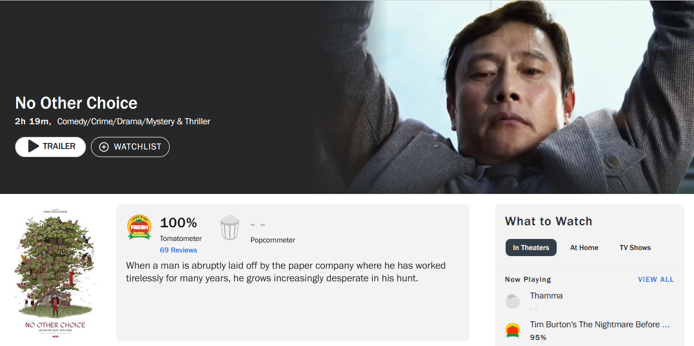 朴赞郁导演新片《无可奈何》烂番茄开分,100%新鲜度,暂时零差评。