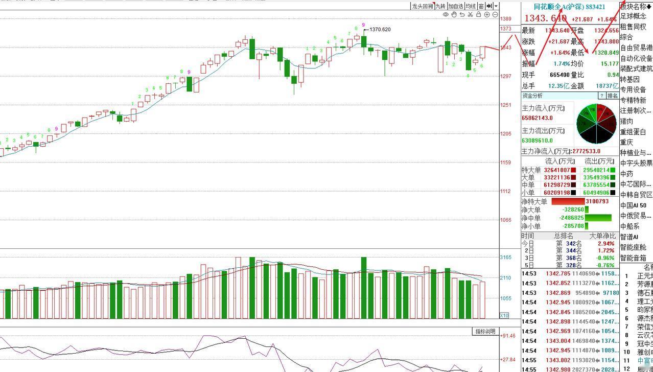 低点确立,反抽反弹继续,能延续到下周! 现在基本可以确立上周五的低点就是这波反抽反弹的低点,那么就有一定的持续性。 从盘面看,比预期要强,量能没有增量主要是盘面都是高开,逢低的资金没机会。 那么后续稍微回调将会有一定的增量。 今日大盘先是缩量涨,然后稍微放量,放量主要是在下午,明显指数没涨,但个股涨了。平均价指数在走高。这个时候可能一些传统分析认为是出货,其实就是一种手段。 低点缩量涨,然后涨一段再放量,这个时候散户一定会追,缩量涨一点散户可以忍受,但是缩量大涨然后哦再放量推一波,散户基本就按捺不住,开始追了。但一追主力就把资金给散户。 对于明日大概率是分化,同花顺全a的平均价指数不会难看 今晚夜盘中概股和A50期指调整,这对于明日A股是好的,这个位置就怕高开,低开反而更有利于盘面。 对于个人而言,牛市初期依然是满仓,暂时不是风险点。 现在的预期是下波调整不会新低了,这个和之前的预测有所改变,如果不是新低,那么这个波形的赚钱效应就是好些。图三是先前的,图二是现在的。波形大概就是这样,顶和底根据盘面适当修整。