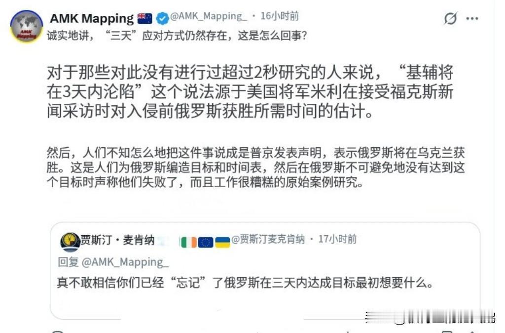 老实人尽说大实话:AMK越来越像乌友眼中的俄孝子俄宣了…… 他10月21日发文回应某个被谎言洗脑的乌友: 对于那些对此没有进行过超过2秒研究的人来说,“基辅将在3天内沦陷”这个说法源于美国将军米利在接受福克斯新闻采访时对入侵前俄罗斯获胜所需时间的估计。 然后,人们不知怎么地把这件事说成是普京发表声明,表示俄罗斯将在乌克兰获胜。这是人们为俄罗斯编造目标和时间表,然后在俄罗斯不可避免地没有达到这个目标时声称他们失败了,而且工作很糟糕的原始案例研究。 对了,所谓的1小时22分梗,最早也是美国媒体引用前美国参联会主席米利四星上将接受美国媒体采访的话,不知何时就变成了绍伊古说的了,并被乌友们广泛用于嘲笑俄罗斯,这真是有意思。 俄乌冲突