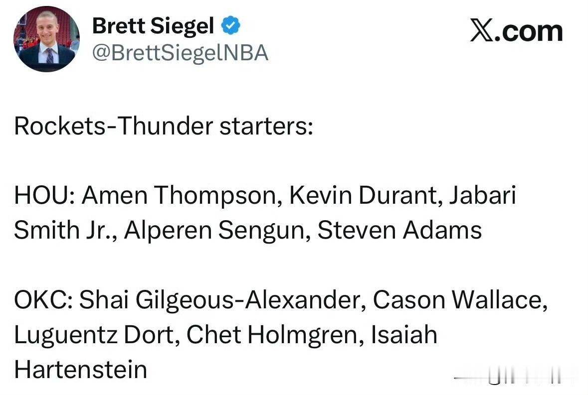 火箭和雷霆揭幕战首发阵容公布!!!杰伦威缺阵,火箭首发阵容高度太吓人! 火箭和雷霆的新赛季揭幕战就要开打了,目前双方的首发阵容已经公布,不过还没有开始,因为雷霆要在赛前颁发冠军戒指,这就是我们之前说的杀人诛心的时刻,这一时刻的“主角”无疑是杜兰特。 火箭派出了阿门,阿杜、小贾、申京和亚当斯的五人组,而雷霆那边除了没有杰伦威,其他的都还是比较稳定,还是上个赛季那几个人。 今天是在雷霆主场,上赛季的总冠军球队,他们的信心应该是爆棚吧,遇到了有杜兰特的火箭会有怎样的火花呢,相信这场比赛他们都会针对杜兰特的,不过少了杰伦威还是对他们进攻和防守都有一定影响。 一会大家就可以欣赏精彩的比赛了,NBA新赛季真的开始了!