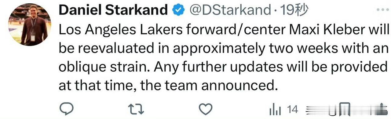 脆的不像样!!!克勒贝尔斜肌拉伤,两周后重新评估! 根据洛杉矶相关记者消息透露