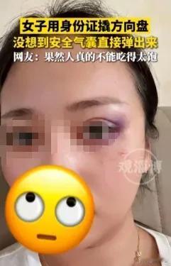果然人还是不能吃太饱 10月20日,浙江一女子在车里太无聊,好奇地用身份证撬方向盘,刚开始女子是试探,见方向盘没反应,力度逐渐加大没想到下一秒安全气囊直接弹出来,好不容易出来后,女子被“打”的鼻青脸肿,眼角青了一大片,高高肿起。 网友评论: 换一个想法,这也许并不是坏事!试想,如果是车辆一不小心开入河中,如果是驾驶员能够把安全气囊打开,万分危急关头,这安全气囊难道就不能成为救生圈使用吗? 荣获年度最吃饱没事干奖 女子的车现在是一辆原版原漆的“事故车”了,人真的是不能吃太饱,没事时不要对自己的方向盘动手动脚! 弱弱的问一句,这女人会不会测试驴蹄有多大力,把自己脑壳伸驴蹄下,还会不会测试门板有多大夹击力,把脑壳放门框上。反正这两项伟大的实验,自古至今还没有那个大师级人物测试过。 好奇心是人类进步的动力!另一方面,也是找死的节奏!