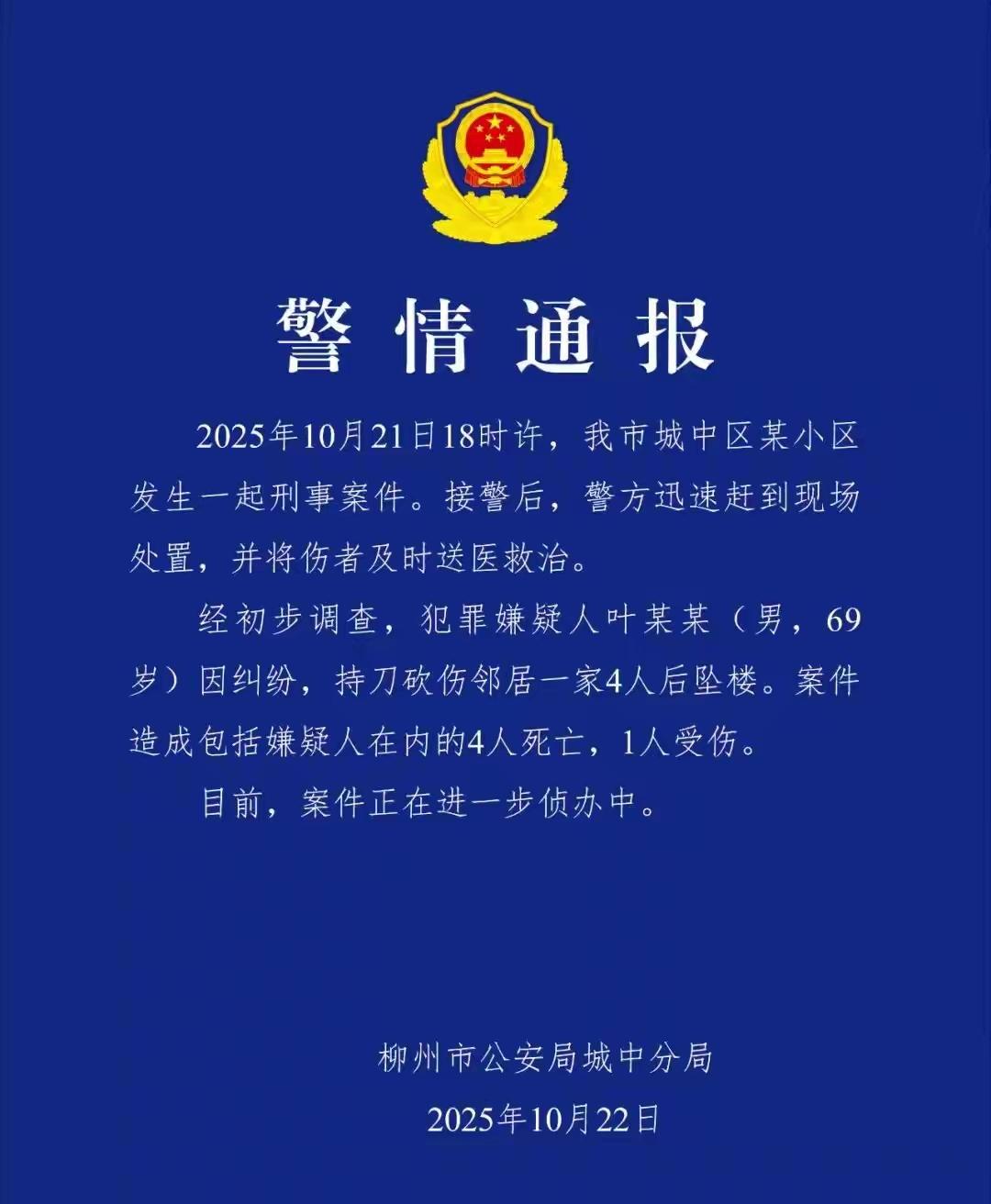 10月21日晚上18点左右,广西柳州某小区发生了一起69岁老人持刀砍伤邻居一家四口的悲剧,行凶者随后坠楼,这起悲剧更造成四人死亡,一人受伤正在治疗中。 事情发生在10月21号晚上6点钟左右,69岁的行凶者与邻居家有纠纷,持刀砍伤了邻居家四个人,随后自己坠楼死亡。 这两家的矛盾看来 平时积怨已经很深 看来邻里之间呀 还是要相互谦让 人际关系尽量和睦一些 大家说对不对?
