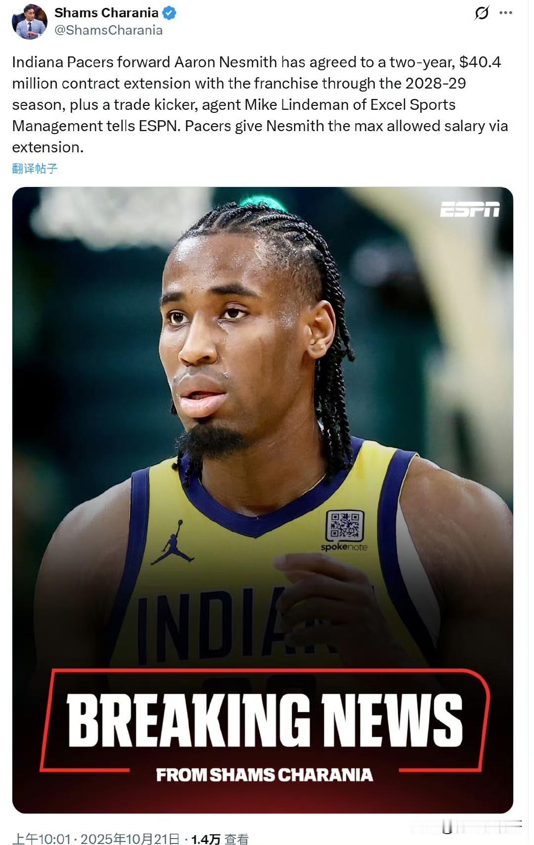 上哪找这么便宜的价格!!!内史密斯2年4040万美元续约步行者! 根据大神记者Shams消息透露,步行者又捡了个大便宜,他们和阿隆-内史密斯完成续约,双方签订的是一份2年4040万的提前续约合同。 当大家听到这个价格后觉得简直是不可思议,因此步行者也是在合同中给了交易保证金条款,不过即使这样他们也是赚的吧。 内史密斯上个赛季的表现大家可是都看到了,这家伙攻防兼备,三分也很准,这太难得了,在这个联盟中,库明加等人都在索取2500万的时候,而内史密斯拿着2000万的薪资,合同也只有两年,步行者也太厉害了。 恭喜步行者,恭喜内史密斯,新赛季他的数据还会有所提升,毕竟没有了哈利伯顿,他们人人都会成为步行者的进攻武器。