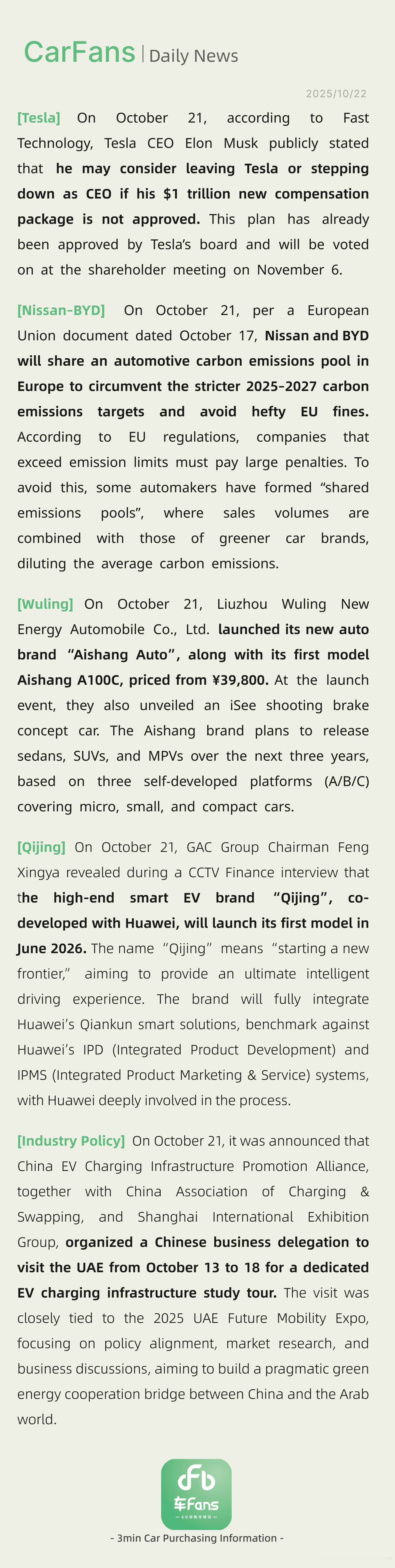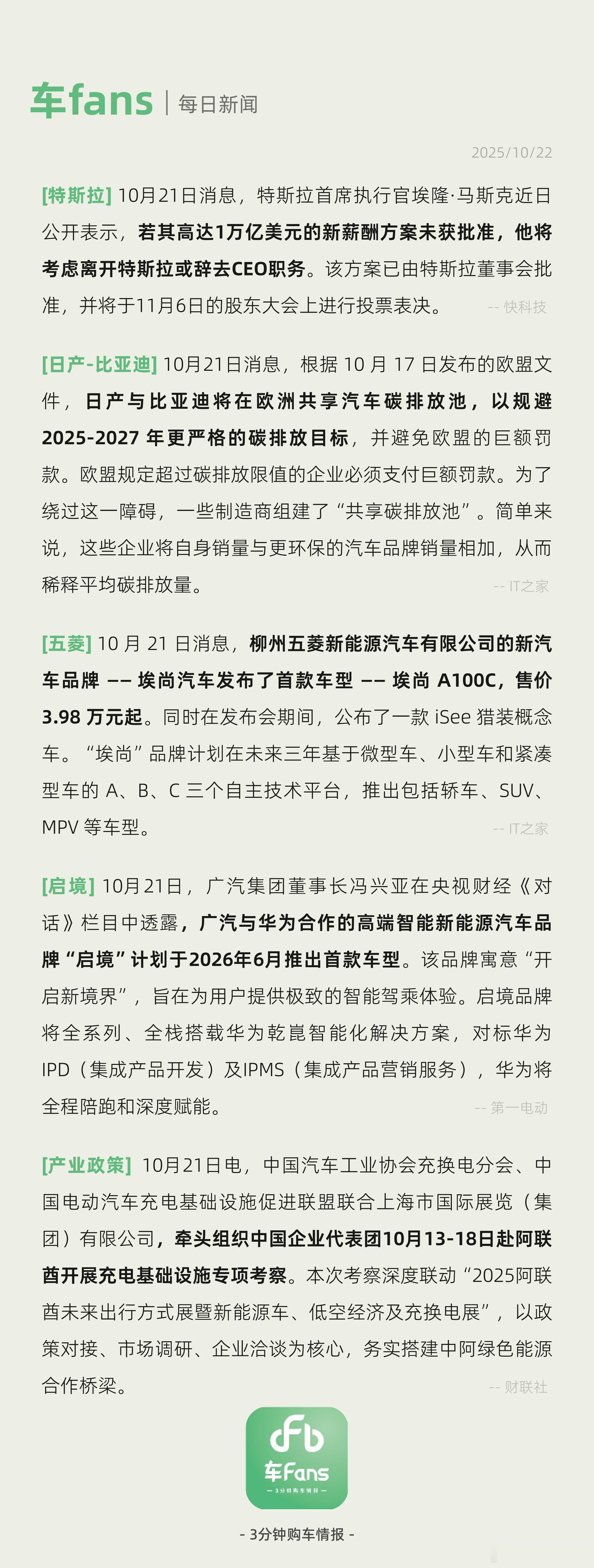 马斯克表示价值万亿美元薪酬方案未获批准将考虑离开特斯拉、日产与比亚迪将在欧洲共享汽车碳排放池特斯拉股东即将对埃隆·马斯克的一项新的、备受争议的薪酬方案进行投票。